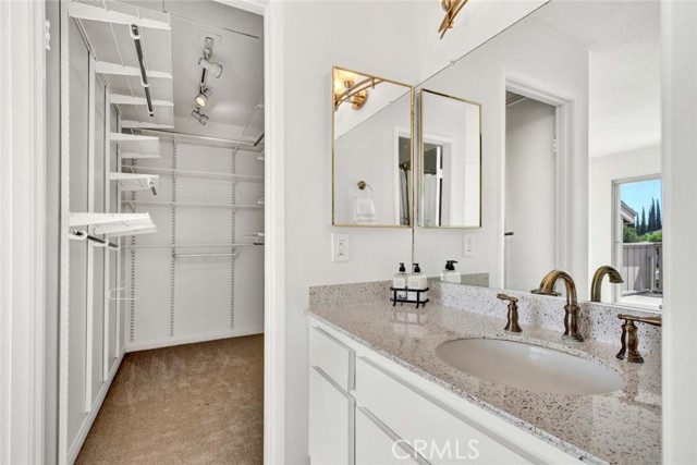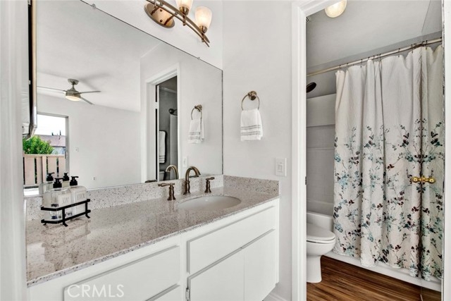 Welcome to Cambridge Green, a gated community that residents don't like to leave. There has not been a home sold here since April 2023! Located on a huge lawn, this 2 bedroom 2 bathroom end unit boasts one of the best locations in the complex, nestled between the pool area and the lighted tennis court. Enter the west facing door to a kitchen and dining room that opens to a large patio with a cozy firepit. The kitchen includes all appliances...refrigerator, gas range, microwave and dishwasher, and is graced with pull out shelves and a tile backsplash for character. The adjoining living room has removable shelves for collectables that line the ceiling. The entire living area has been upgraded with luxury vinyl flooring, scraped ceilings and recessed lighting. There is a bedroom and 3/4 bathroom on the main floor, and 2 deep closets under the stairs for lots of storage. Venture upstairs to a huge primary suite that boasts a walk in closet with organizers, vanity area, master bath and a patio sized balcony to sit outside and enjoy your morning coffee or a good book. The furnace, central air conditioning, and water heater have been recently upgraded. The 2-car garage has storage shelves, laundry hook ups, and the washer and dryer are included in the sale. Cambridge Green offers its residents a pool, spa, clubhouse, tennis court, and plenty of guest parking. This home is located near Mile Square Park, Little Saigon, shopping, churches and centered between Disneyland and the beach.