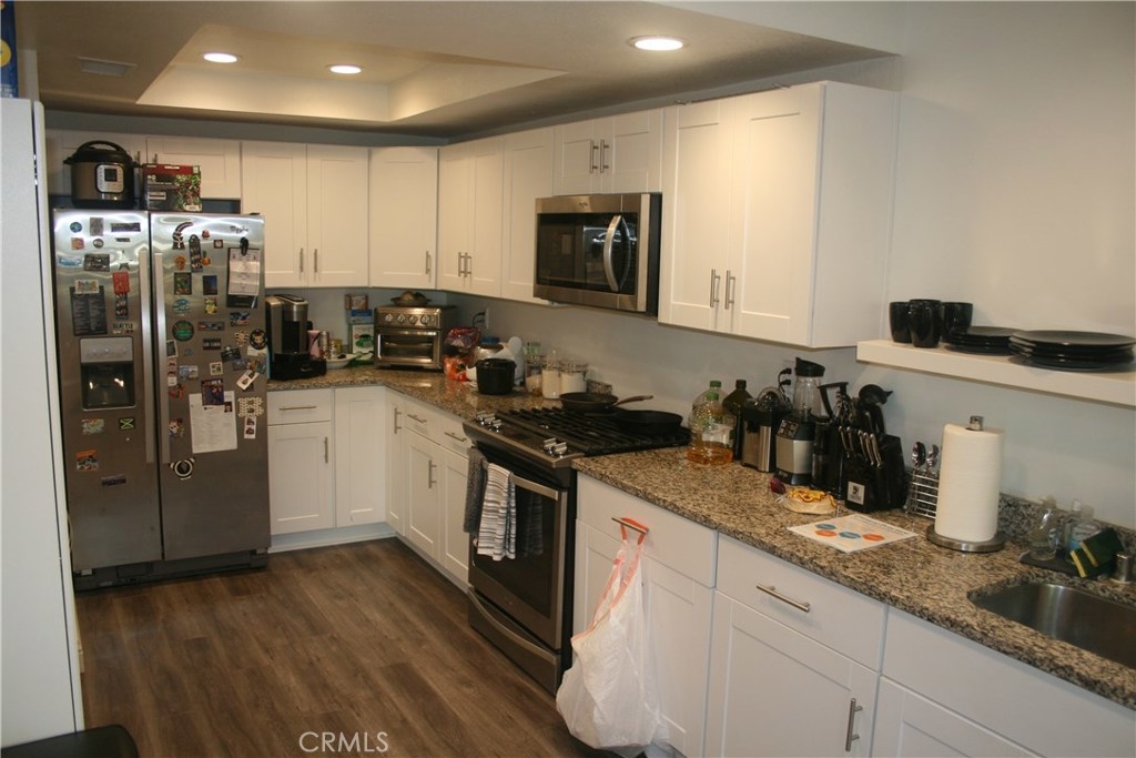 Beautifully updated end unit condominium, conveniently located in the historic French Park district near downtown Santa Ana. The inviting community open space as you enter is welcoming and spacious. Completely updated and renovated, this property is move In ready! Upon entry, this 2 story townhouse features a spacious living room which offers recessed lighting and a custom fireplace. One of the highlights is the updated contemporary kitchen with new cabinetry, granite counters, and stainless steel appliances. Open floorplan connects the dining area, kitchen and living room, making it ideal for entertaining. The dining room opens up to your private patio area, perfect for those summer BBQs! This home features new flooring from entry way through the kitchen area, along with dual pane windows throughout the unit. Downstairs also offers a half bath, updated with granite countertops, vanity and light fixture. Upstairs features 2 spacious master bedrooms. One master features high vaulted ceiling and walk in closet. Both bedrooms feature updated bathrooms with tile flooring, granite countertops, tubs and light fixtures. This home also features central heating and A/C with ceiling fans throughout. The underground parking has 2 side by side parking spaces and a large private storage area. Bonus of washer/dryer and refrigerator to be included! Walking distance to the OCSA, McFadden public market and 4th St. Market. A quick drive to the train station and the 5 freeway. A