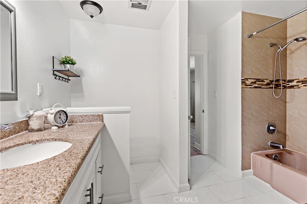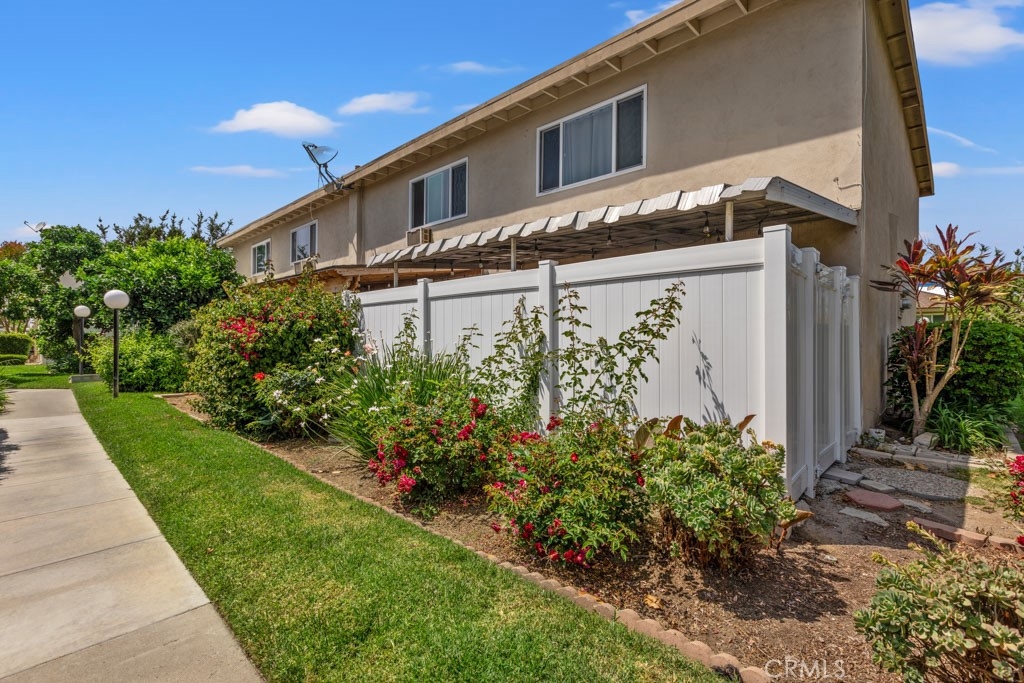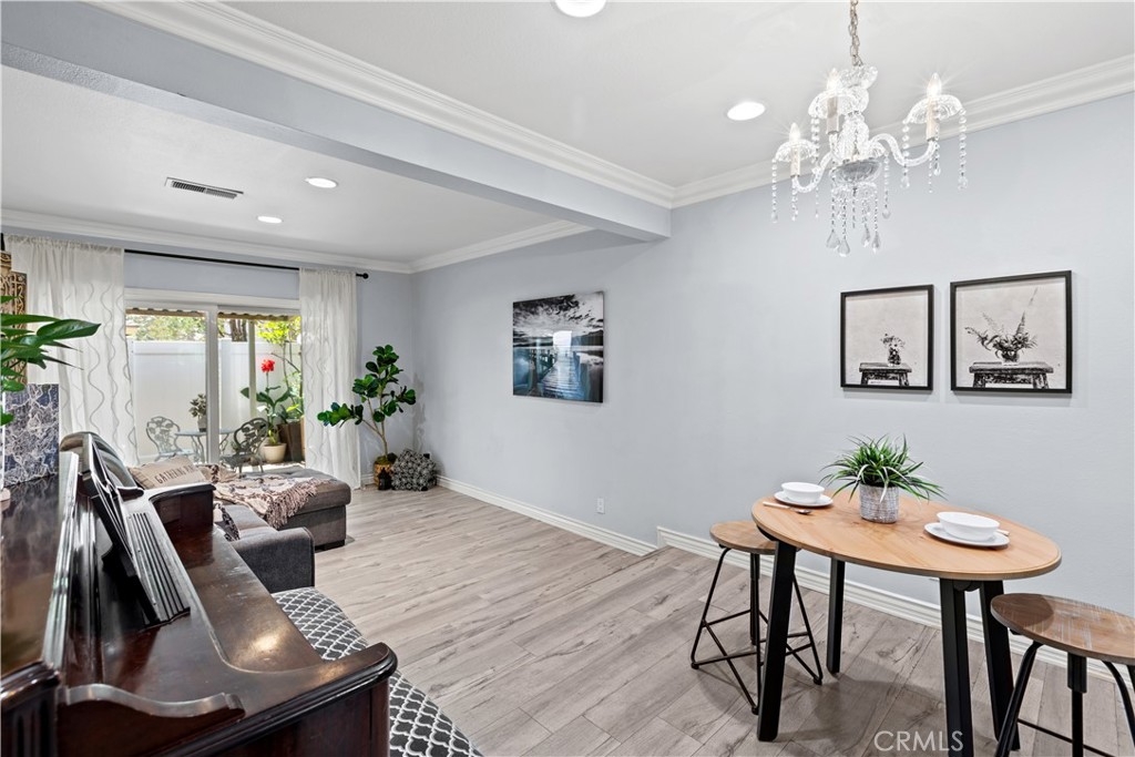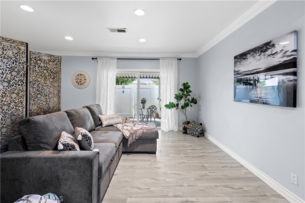Hillview Regency neighborhood 2 Bedroom 1.5 Bathroom Townhome with a great interior tract location offering lushly manicured landscaping with walkways, greenbelts and beautiful trees. Located within the award-winning Tustin Unified School District. Natural lighting invites you into the beautifully remodeled kitchen with breakfast bar open to the dining room and large living room, all laced with crown molding and dimmable recessed lighting. Downstairs also has a half bath and additional area with an in-home office option and its own indoor laundry (there is additional community laundry available). The two spacious bedrooms are on the second floor, each with direct access to the updated jack-n-jill full bath with separate shower and bathtub. Granite counter tops, lovely grey laminate flooring throughout, dual pane windows and patio slider, central heating and wall AC unit are some of the additional features. Enjoy outdoor living in the spacious patio with newer vinyl-fencing and patio cover! Parking includes a private single car garage with electricity for light and projects, X-large storage, two wireless remotes and Wifi smart garage opener with an ultra quiet belt, wall pad and a permit for a parking spot. The association dues include water and trash utilities! The community offers a swimming pool, clubhouse and shuffleboard. Close to shopping, restaurants, entertainment, and easy access to the 5, 55, and 22 freeways.
