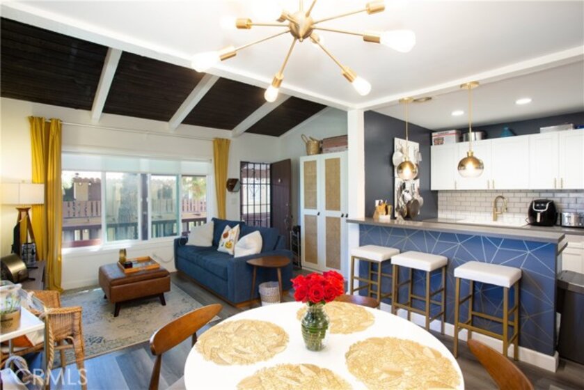 Completely renovated mid-century modern condo in the guard-gated community of MacArthur Village! This top floor end unit has a private patio with views of the adjacent park. Enter inside to find all new water-resistant vinyl flooring, windows, and Lutron smart lighting throughout. The living room features an open concept floorplan with custom built-ins and vaulted wood beam ceilings that allow for an abundance of natural light. Upgraded kitchen includes farmhouse sink, quartz countertops, soft close shaker cabinets, and GE fingerprint-resistant appliances. A separate oversized master suite includes a custom closet with built-ins. The bathroom has a freestanding wood vanity with modern above-counter vessel sink, brass Moen fixtures, and soaking tub with beveled subway & decorative ceramic tile. The community features multiple amenities including pools, tennis, basketball and volleyball courts, a gym, barbecue area, on-site laundry, and 24 hr. security guard. Sewer, trash, and water included. Conveniently located in South Coast Metro area near shopping, dining, and entertainment with easy access to the 405, 55 and 73 freeways.