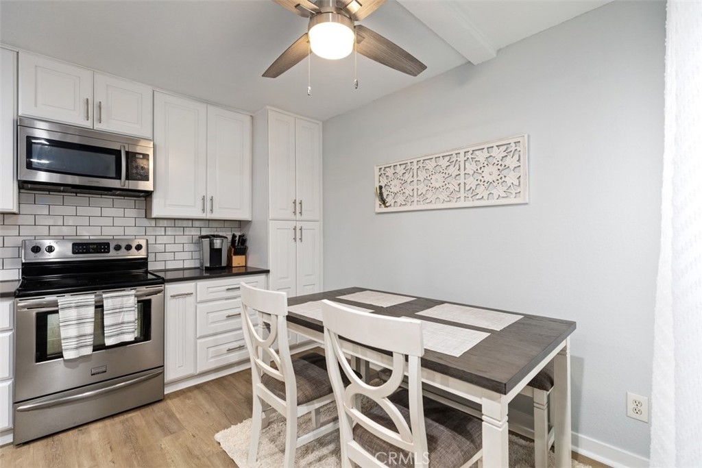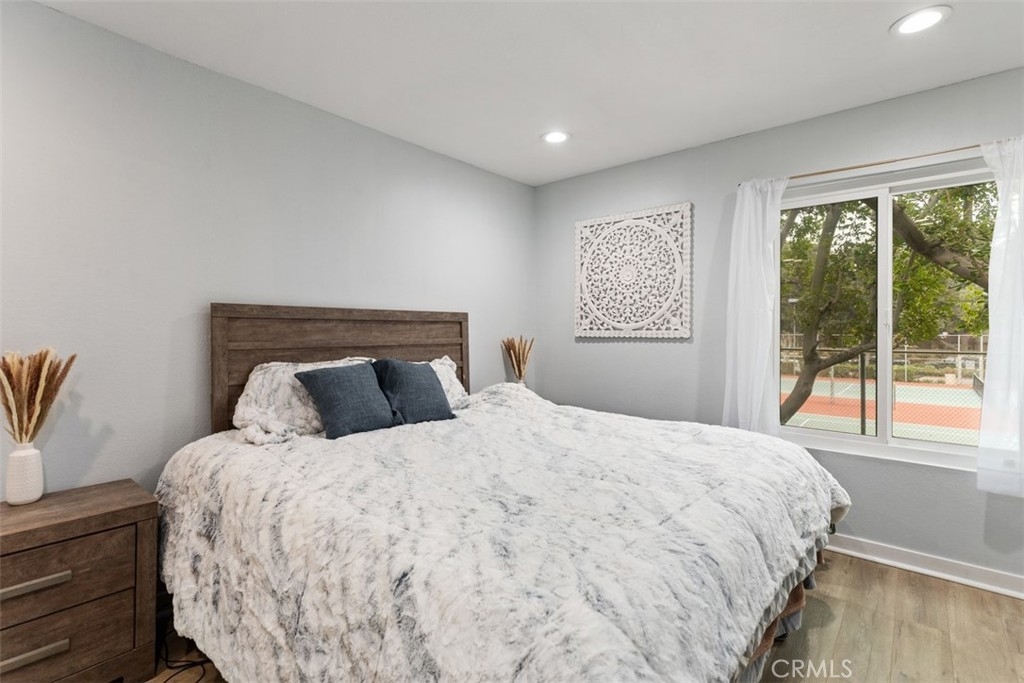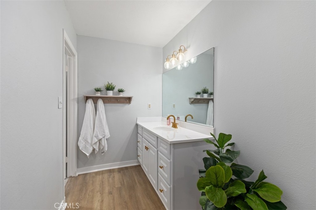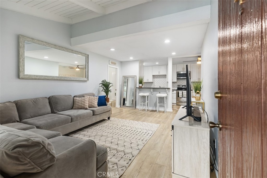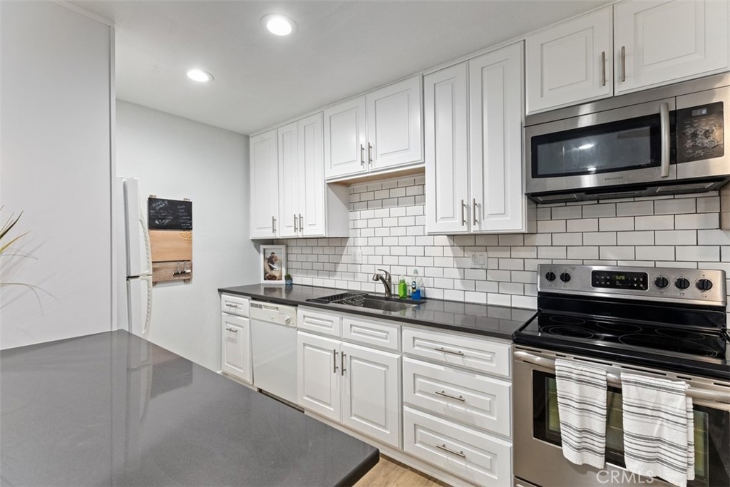 Beautifully renovated one bedroom condo in the gated community of MacArthur Village. Condo offers new Helsinki (European Collection) laminate flooring by Republic that has triple moisture protection and eight times more scratch resistant than wood floor. New Tuscany style windows with screens. New baseboards in each room. All recessed lighting updated with Phillips 6 inch surface cans with multi color temperature. The kitchen was renovated in 2019 and has the following upgrades: Silestone Quartz Countertops. White Koville cabinets with soft close drawers. Samsung microwave with hood over stove. White Subway tile installed for backsplash. The bedroom is spacious and has master bath with multiple new upgrades. Bathroom has new tub, new shower walls, new toilet and new tile flooring. New 60 inch wide White Glacier Bay bathroom vanity cultured marble sink top, brushed gold drawer knots and vanity mirror. New 8 inch widespread double hand bathroom faucet with pop-up drain in brushed gold. New Modern 3 light gold bathroom vanity light with clear globe shades and LED bulbs. The community features multiple amenities including 5 pools, tennis, basketball and volleyball courts, a gym, barbecue area, on-site laundry, and 24 hr. security guard. Sewer, trash, and water included. Property is close to South Coast plaza and the 55 & 405 freeways.