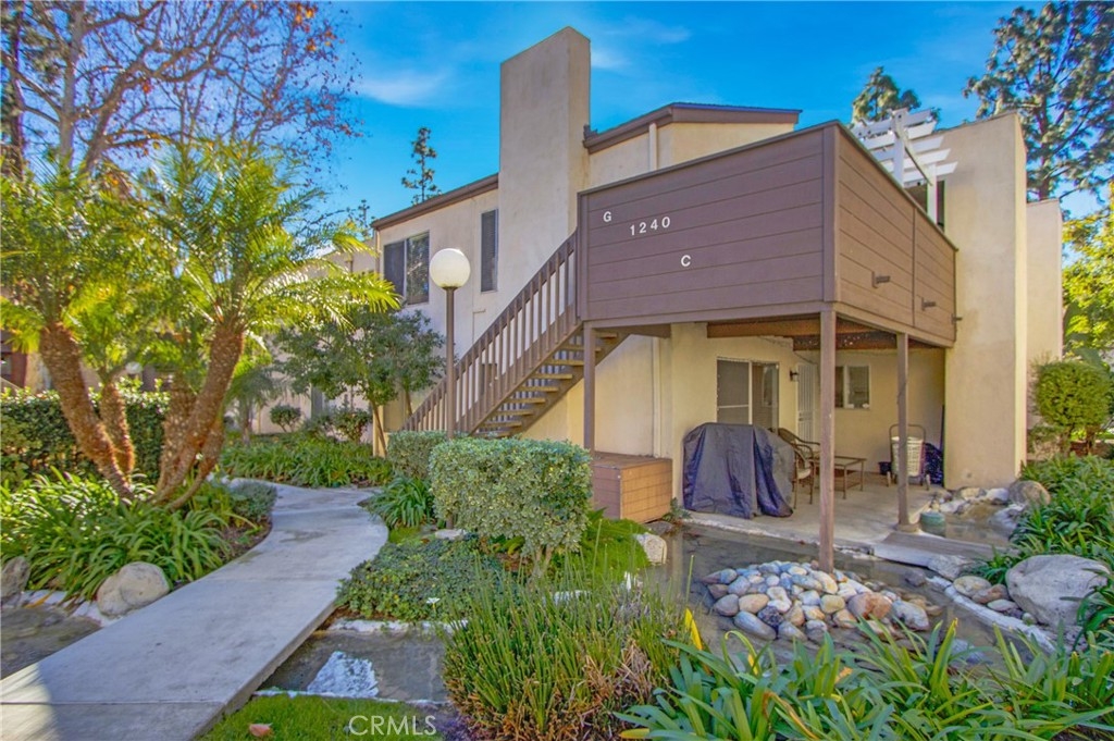 Captivating upper corner unit within the well-maintained Cabrillo Park Townhomes Association. This turnkey 2-bedroom, 1-bath boasts a spacious open area, seamlessly combining living, dining, and kitchen spaces with exposed beams adorning the ceiling. The primary suite features a custom walk-in closet, and upgraded laminate and tile flooring grace the entire home. Enjoy the private patio deck entry, HOA-covered utilities (water, trash, sewage, and gas), and ample guest parking. The property includes 2 parking spots (1 carport spot 369 and 1 permit pass). Take advantage of community amenities, including a pool, 3 spas, club house, private gym, and 2 laundry facilities. Nestled in a serene environment with lush greens and gentle streams, this home is conveniently located near freeways, shopping, restaurants, parks, Disneyland, and falls within the award-winning Tustin school district. Seize this fantastic opportunity!