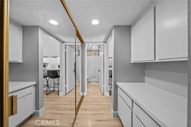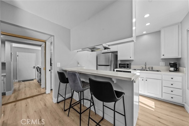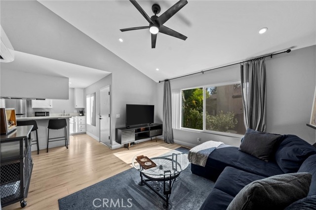 Move-in-ready and beautifully updated, this junior one-bedroom, one-bathroom home in the Cabrillo Park community offers style, modern upgrades, and a prime Santa Ana location. This upstairs corner unit features vaulted ceilings, recessed lighting, large dual-paned windows, beautiful luxury vinyl plank flooring, and an open layout that feels bright and inviting. The sleeping area is thoughtfully positioned within the space, and if desired, doors or a wall can be added to create a fully enclosed bedroom. The kitchen has been updated with white cabinetry, quartz countertops, stainless steel appliances, and a breakfast bar. with seating. Along with cosmetic updates, the home includes major improvements such as dual-paned windows installed in 2024 and a newer HVAC system installed in 2023, which enhance energy efficiency and everyday comfort. The bathroom has also been refreshed, giving the home a clean and modern feel. A private patio provides outdoor space and includes a personal storage perfect for your extra belongings. Parking includes one assigned covered carport plus an additional permitted space on a first-come basis. The community offers a pool, spa, fitness center, recreation areas, two on-site laundry rooms, and beautifully maintained grounds with ponds, running streams, and lush landscaping. Another added benefit is that the HOA covers water, trash, and gas utilities. The location is extremely convenient, with nearby grocery stores, dining, Main Place Mall, and easy access to the 5, 55, and 22 freeways for commuting throughout Orange County. Parks, schools, and the nearby city of Tustin are just minutes away, making everyday errands and activities simple. This is an amazing opportunity to own a beautifully updated home with great amenities in Orange County at this price point.