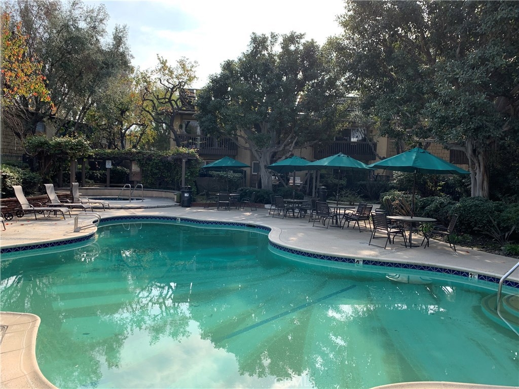 Downstairs unit with back patio and community pool. Complex is approved by FHA. 3050 S Bristol St #15J / #142. This property has one carport and one parking space.