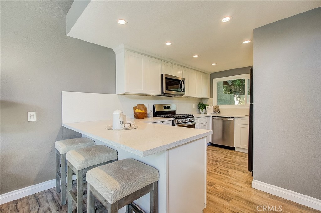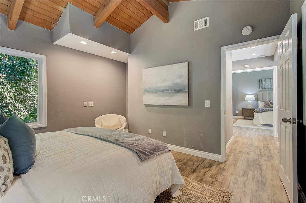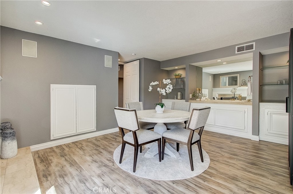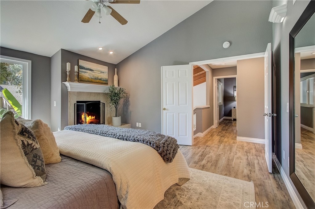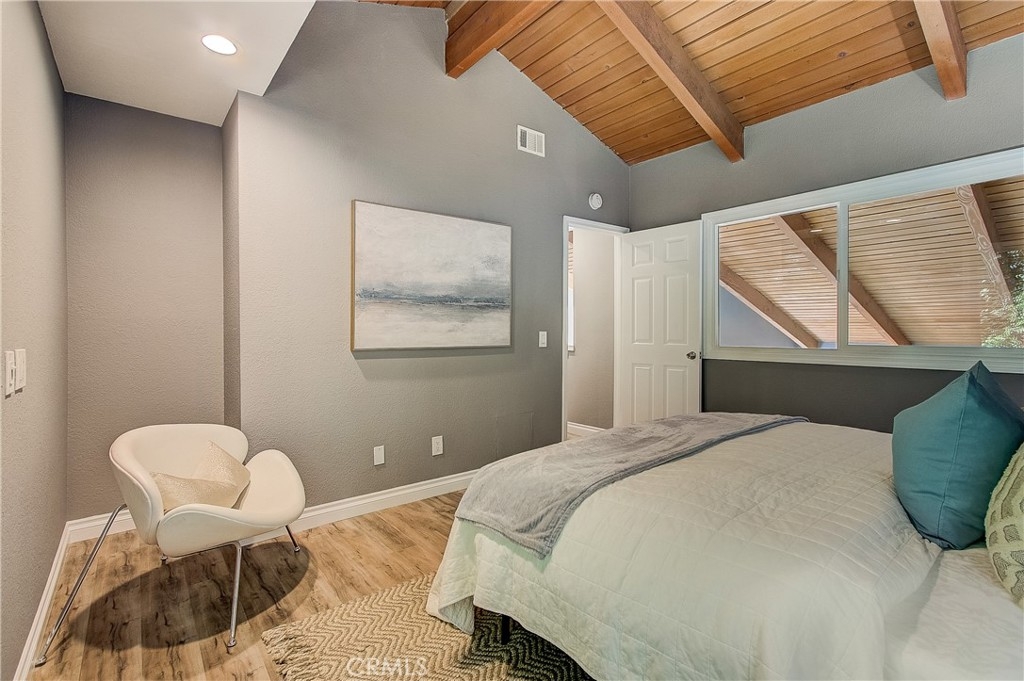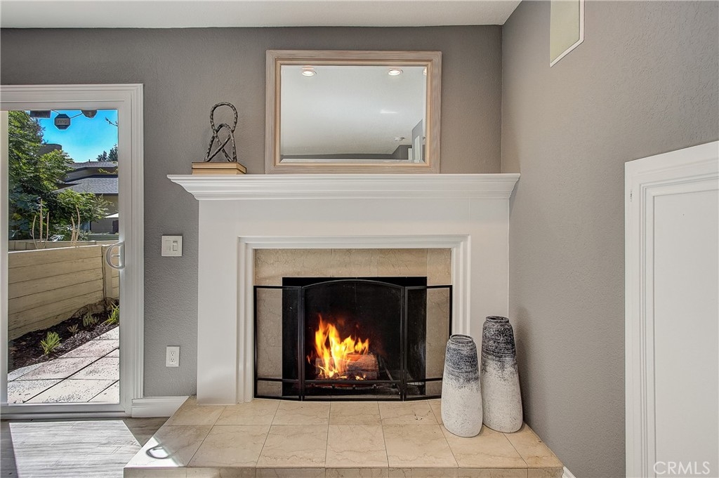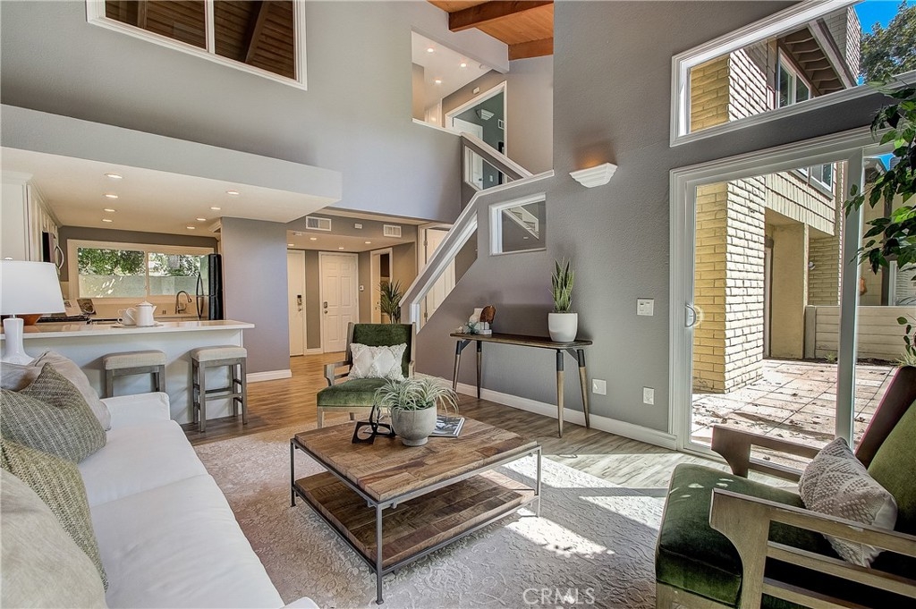 Beautifully updated home with private, gated courtyard entry. Light and bright with vaulted ceilings and lots of windows. The cheerful kitchen is open to the living area and features a breakfast bar and stainless steel appliances. Rustic wood beam ceilings and a fireplace in the living room make this home pop. The downstairs room could be used as formal dining with a wet bar, game room, or den.Three bedrooms upstairs. Primary bedroom with double door entry, fireplace, spacious closet, and updated bathroom. Two-car garage with laundry hookups. Beautiful outdoor patio area with access to well-maintained greenbelt. Community pool, spa, and clubhouse conveniently located directly across from unit. You won't want to miss out on this!