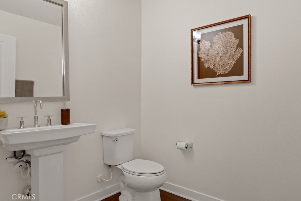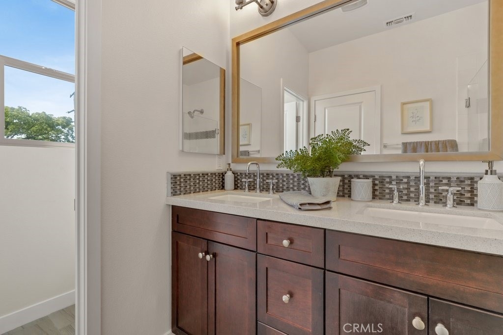 This beautiful contemporary-style home features new white bright paint, modern lighting fixtures, recessed lighting and upgraded Vinyl Plank flooring make for an elegant space. Enter the spacious living with high ceilings and large windows that allow an abundance of nature light to illuminate the open floor plan throughout. The kitchen impresses with rich espresso tone cabinets, long granite countertops, full back splash and plenty of storage. The stainless-steel appliances include a cooktop, single oven, microwave and dishwasher. Delight in the adjacent dining area with double glass doors that open to the private back patio. A half bathroom completes the downstairs. Up the stairs to the generous size bedroom with new carpet and ceiling fans. The spacious primary bedroom, walk-in closet with an ensuite bathroom features tile floors, vanity and glass enclosure shower. The common hallway area shares a full bathroom, dual sinks, tile tub/shower combo and inside laundry includes a stackable washer and dryer. A two-car detached garage with hanging storage, direct access through the patio, A/C unit and Eco-Bee Thermostat system. Nearby great shopping, restaurants, Museums, parks, easy access to the 55, 5, 22 and 57 Freeways.