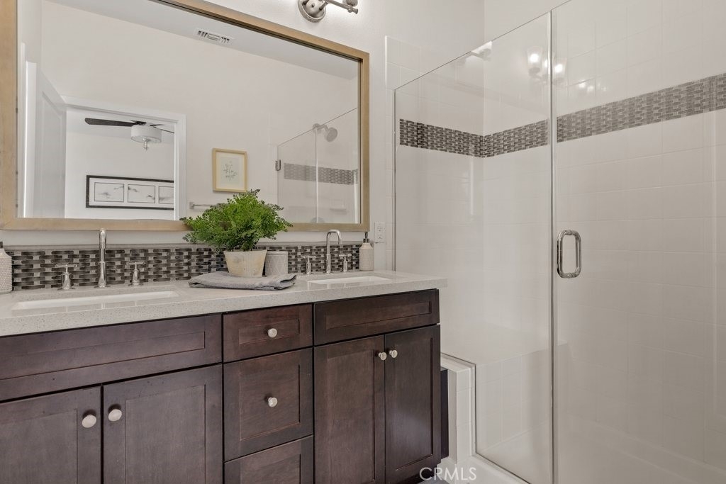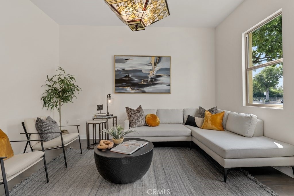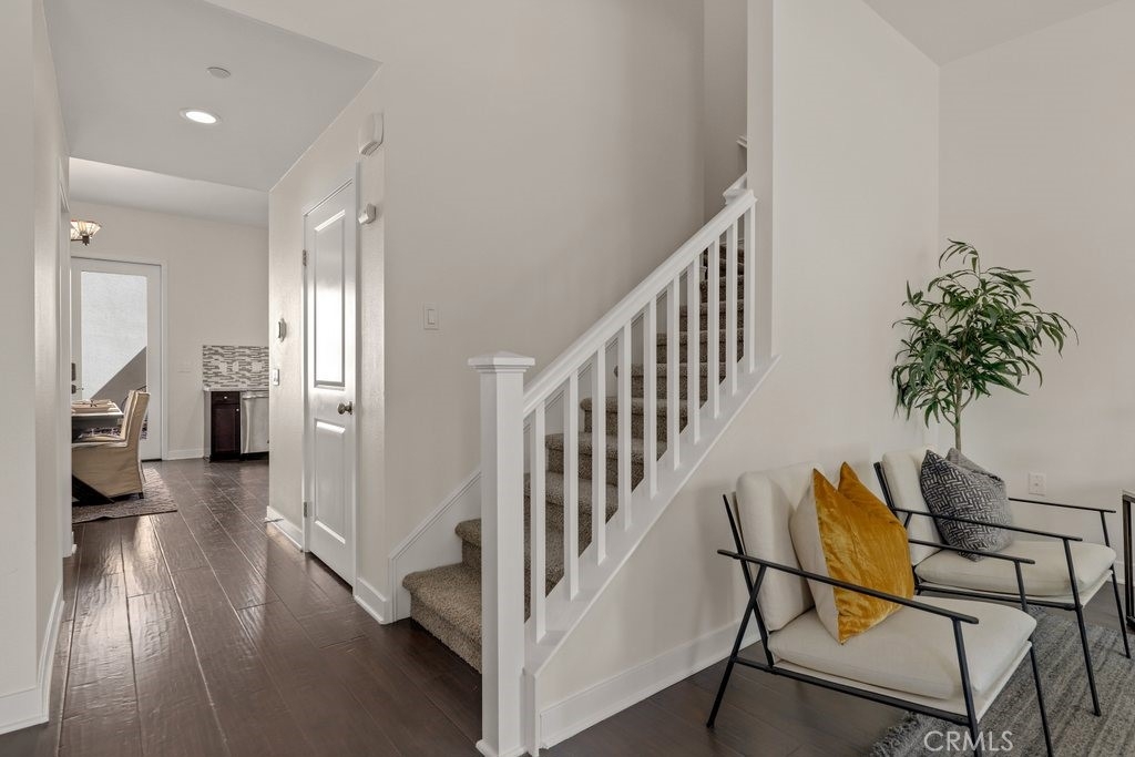 This beautiful contemporary-style home features new white bright paint, modern lighting fixtures, recessed lighting and upgraded Vinyl Plank flooring make for an elegant space. Enter the spacious living with high ceilings and large windows that allow an abundance of nature light to illuminate the open floor plan throughout. The kitchen impresses with rich espresso tone cabinets, long granite countertops, full back splash and plenty of storage. The stainless-steel appliances include a cooktop, single oven, microwave and dishwasher. Delight in the adjacent dining area with double glass doors that open to the private back patio. A half bathroom completes the downstairs. Up the stairs to the generous size bedroom with new carpet and ceiling fans. The spacious primary bedroom, walk-in closet with an ensuite bathroom features tile floors, vanity and glass enclosure shower. The common hallway area shares a full bathroom, dual sinks, tile tub/shower combo and inside laundry includes a stackable washer and dryer. A two-car detached garage with hanging storage, direct access through the patio, A/C unit and Eco-Bee Thermostat system. Nearby great shopping, restaurants, Museums, parks, easy access to the 55, 5, 22 and 57 Freeways.