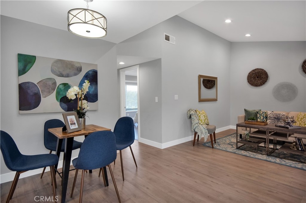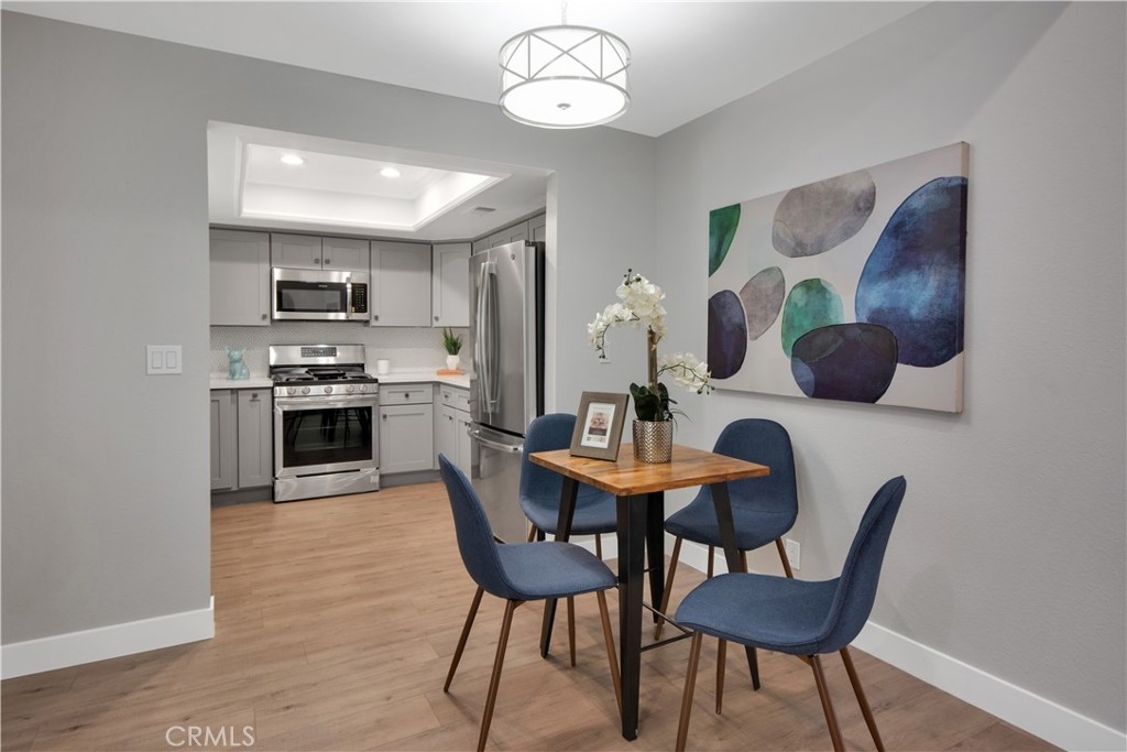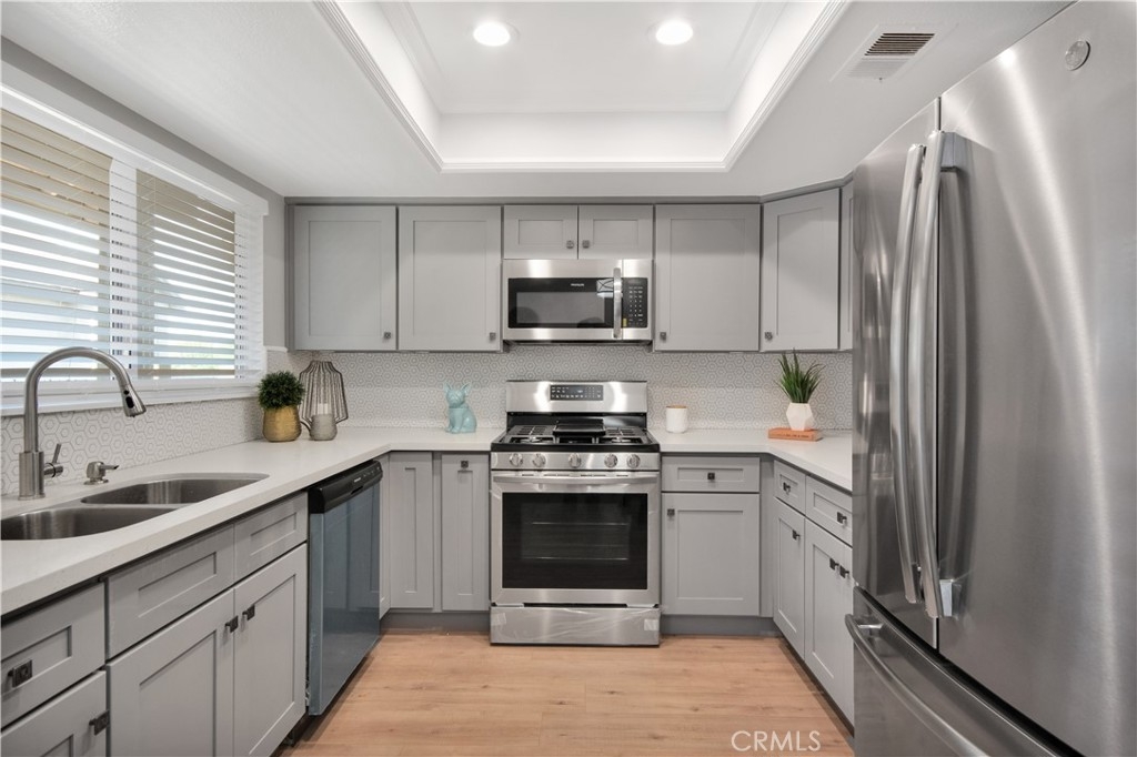 From the moment you arrive, you will absolutely love this recently remodeled top-floor unit nestled in the Westerly Park community of Santa Ana. The kitchen opens to the dining area and living room, making entertaining a breeze. Upgraded just a few months ago with new kitchen and bathroom countertops, lighting, and cabinets; new mirror, bathub, and enclosure in the bathroom; new kitchen appliances; and new lighting and flooring throughout. Both bedrooms feature enormous closets. Beautiful, gated complex with well maintained grounds and community pool. Parking is never an issue with the detached, one-car garage and assigned parking space. Hurry! Homes in this excellent area do not last!