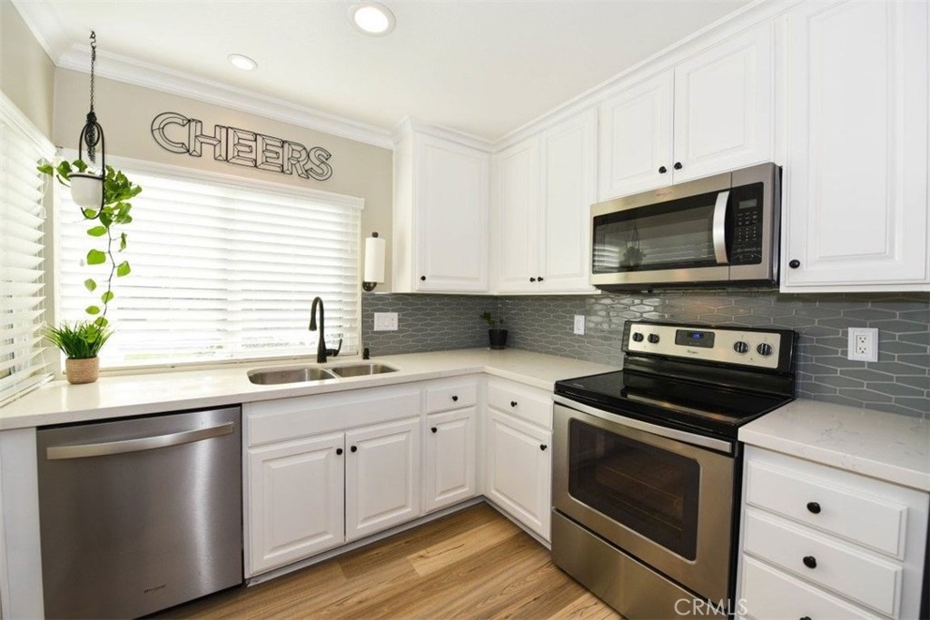 GORGEOUS STARTER END-UNIT CONDOMINIUM! Great Opportunity Condominium in a Highly Desirable South Coast Metro Area. Two Spacious Bedrooms, Master Bedroom with Walk-In-Closet. One Remodeled Bathroom. Upgraded Kitchen with Quartz Counter Tops. New Laminate Flooring Throughout with Upgraded Baseboards. Spacious Dining Area. Recessed Lighting and Beautiful Crown Molding Throughout. With Convenient in unit Laundry and Two Car attached Garage. Central Heat and A/C. Association Amenities; Pool, Spa, Basketball Court and Playground.