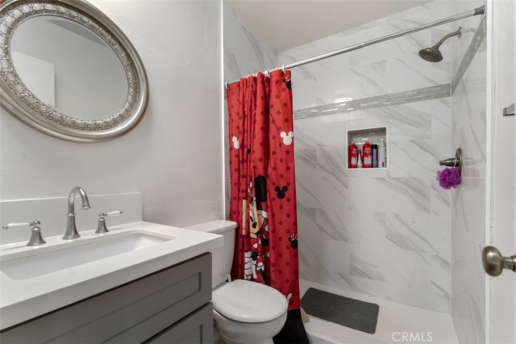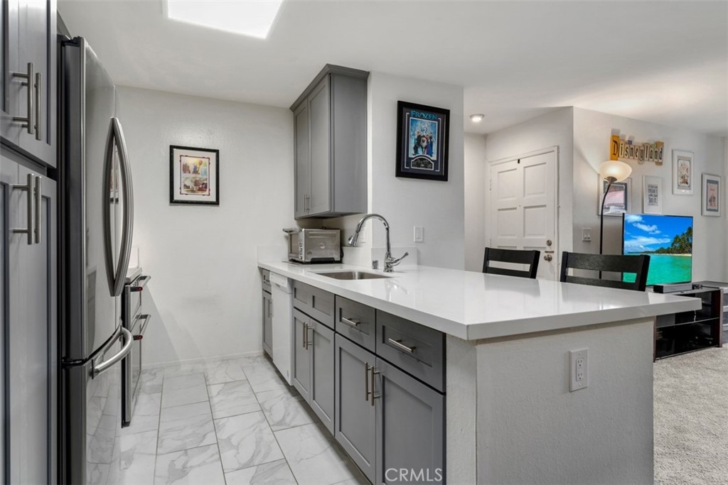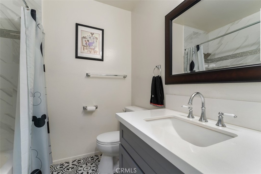 Beautifully upgraded 2 bedroom, 2 bathroom condo in the gated community of Woodside Village just minutes from South Coast Plaza. This upstairs unit is in the quiet inner part of the complex. As you enter, the gorgeous kitchen opens to the living room and dining area. The Kitchen boasts a large peninsula style Island with bar seating, quartz counter tops, self-closing cabinets and drawers, stainless steel appliances and tile flooring. The Spacious dining room area opens to the cozy living room with sliding doors that lead to the balcony. Both bathrooms have been upgraded with designer tile and newer vanities. The master bathroom has a large walk-in shower. The second bedroom is a nice size and adjacent to the hallway bathroom. This very desirable community includes 3 pools, a spa, a clubhouse and community laundry room. Water, gas and trash are included in the very affordable HOA dues. There is one carport with some storage and a parking pass. Close to South Coast Plaza, the Segerstrom Center of Arts, schools, restaurants and freeways.