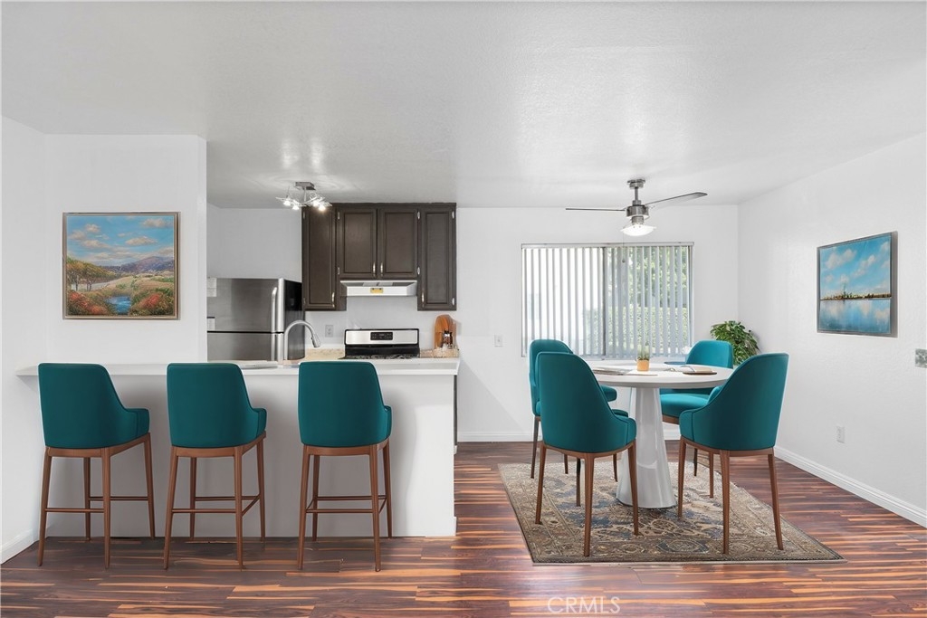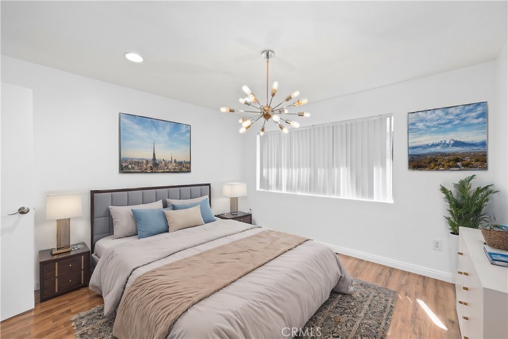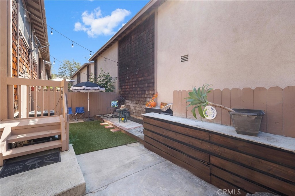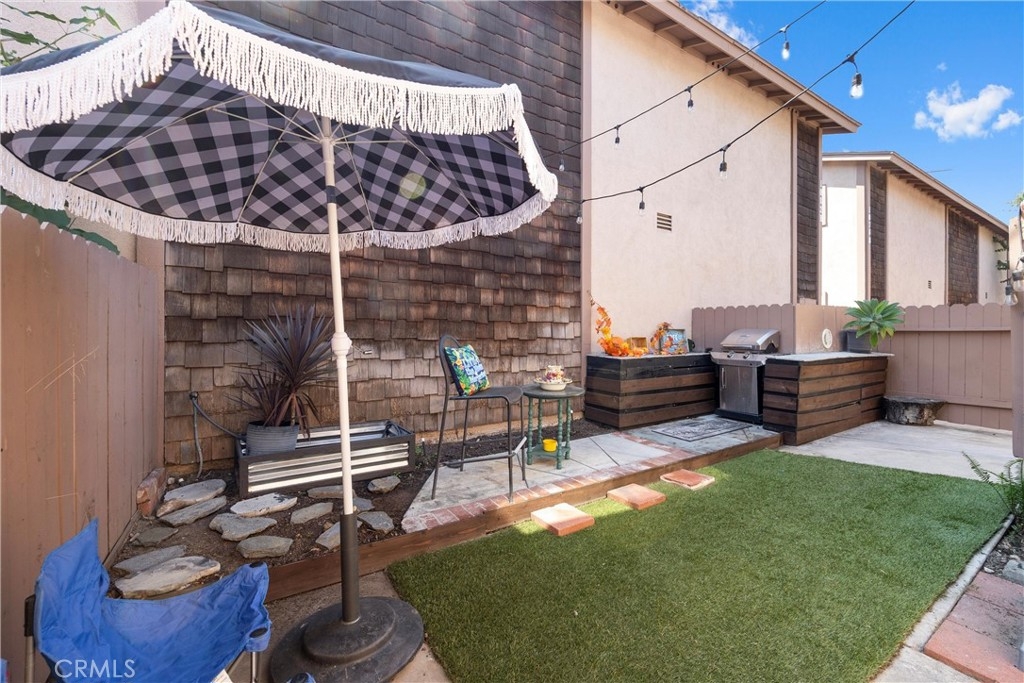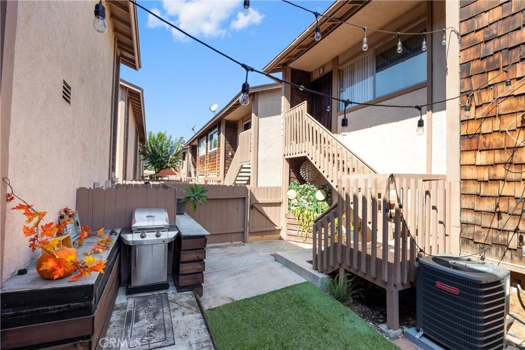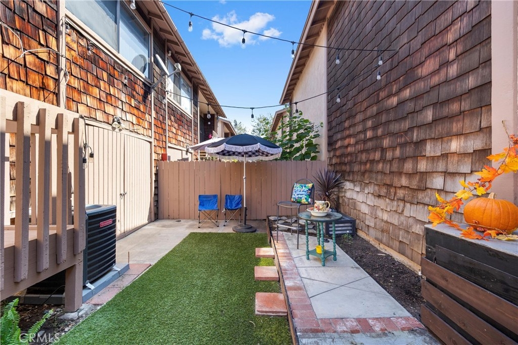 Welcome to this beautifully FULLY UPGRADED, END UNIT 1-bedroom, 1-bath condo that offers a perfect blend of comfort, convenience, and easy living. This turnkey home has been thoughtfully updated, making it an ideal choice for those seeking a move-in-ready property. One of the standout features of this condo is its private downstairs patio courtyard with a BBQ Grill, offering a peaceful retreat perfect for relaxing, gardening, or enjoying outdoor meals with a built in counter for big buffets for friends and family. The courtyard seamlessly extends your living space, with an spacious storage, creating an inviting atmosphere for both you and your guests. Inside, you'll appreciate the fresh upgrades throughout, with beautiful woodlike flooring providing a modern and stylish touch. The open-concept layout combines the living area with recessed lighting, dining area with ceiling fan, and kitchen area with stainless steel appliances and a counter bar, all with central air conditioned ensuring a spacious and comfortable environment for daily living. The bedroom is a tranquil space with ample natural light and a beautiful Chandelier and custom walk in closet with jewerly drawer, the bathroom features modern finishes, completing this home's fresh appeal. The Homeowners Association (HOA) includes a range of impressive amenities to enhance your lifestyle. Enjoy the community pool, spa, BBQ and picnic area, gym, and clubhouse, all designed to help you relax and socialize without leaving the comfort of your neighborhood. Whether you're lounging by the pool on a sunny afternoon, unwinding in the spa, or hosting a barbecue with friends, these amenities add extra value to your living experience. Location is another key highlight. This condo is conveniently situated near both the 55 and 5 freeways, making commuting and travel a breeze. You're also just a short drive away from popular attractions such as the Santa Ana Zoo and Disneyland, offering endless opportunities for fun and entertainment. With its desirable features, low-maintenance lifestyle, and prime location, this condo is a must-see. Don’t miss your chance to call this upgraded, turnkey home your own!
