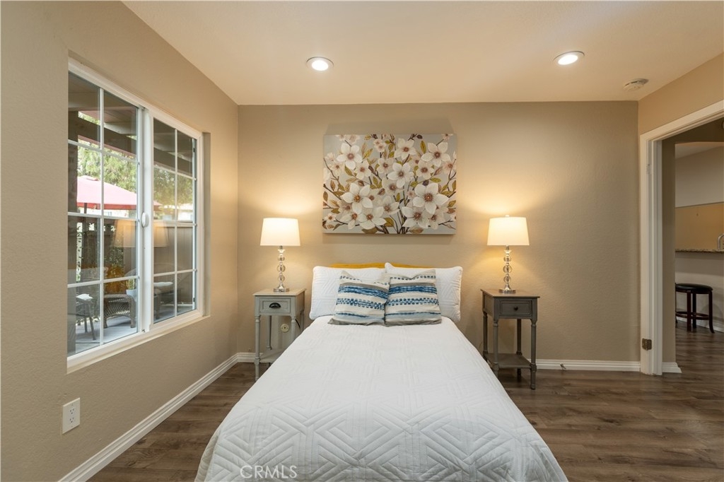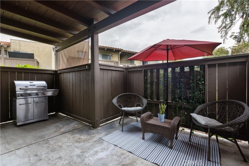 Welcome to this beautifully updated ground-level end-unit condo in Monterey Villas, featuring 2 bedrooms and 2 bathrooms. Located in a quiet corner of the community, this home offers a great balance of privacy, comfort, and modern upgrades. The spacious primary bedroom includes a double closet and en suite bathroom, while the second bedroom is perfect for guests, a home office, or family. Inside, you'll find laminate flooring throughout, recessed lighting, and double pane tinted windows. The remodeled kitchen opens to the dining area, creating a welcoming space that’s great for everyday living and entertaining. Step outside to a private west-facing patio—ideal for enjoying your morning coffee or winding down with evening drinks as the sun sets. A rare bonus is the extra green space in front of the unit, with no neighbors directly facing you, giving it the feel of a private front yard. Set within the gated Monterey Villas community, residents enjoy access to a range of amenities including a pool, volleyball spot, gym, and tennis courts. The complex is also dog-friendly, offering a comfortable and active lifestyle for both residents and their pets. Conveniently located in the desirable Tustin Unified School District, this home is just minutes from local shopping, dining, parks, and public transportation, with quick access to the 5, 55, and 22 freeways—making it an ideal spot for commuters and families alike