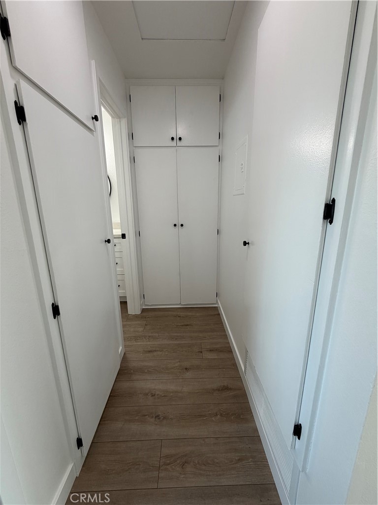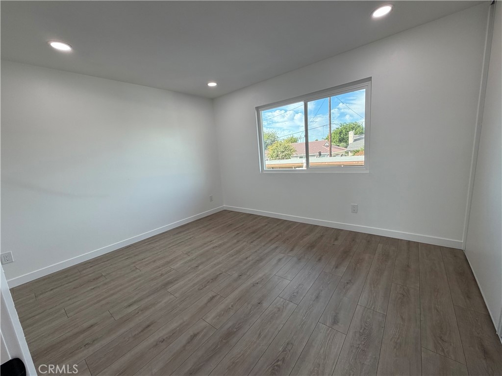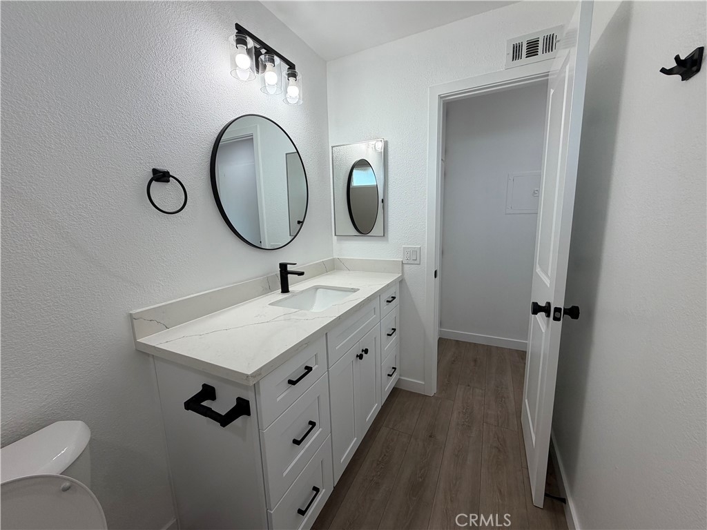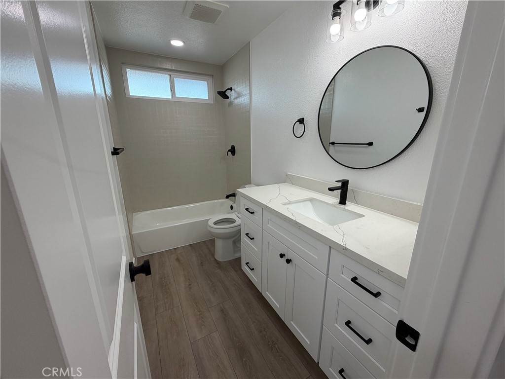 Charming, fully upgraded one-bedroom, one-bath upper-level unit in the gated community of Bristol Place. This light and bright home has been completely renovated and freshly painted throughout. Upgrades include new laminate flooring and baseboards, dual-pane windows with blinds, recessed lighting, a ceiling fan with remote, sliding closet doors, and all new fixtures, outlets, and hardware. The updated kitchen features white shaker cabinets with soft-close doors and drawers, quartz countertops, a stainless-steel sink, gas range with hood and light, garbage disposal, and modern faucet—perfect for both everyday living and entertaining. The remodeled bathroom offers quartz countertops, a soaking tub, new vanity with soft-close doors and drawers, updated shower fixtures, single-flush toilet, new lighting, and a medicine cabinet. The unit includes one assigned carport space plus one additional unassigned parking space. Community amenities include a pool, laundry room, and outdoor cooking area with picnic tables. Conveniently located near shopping, public transportation, and easy freeway access.