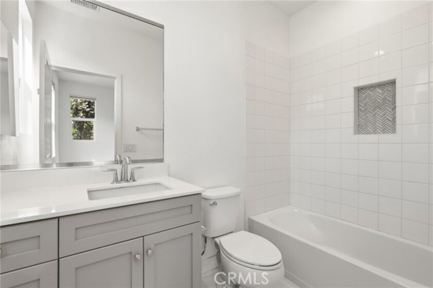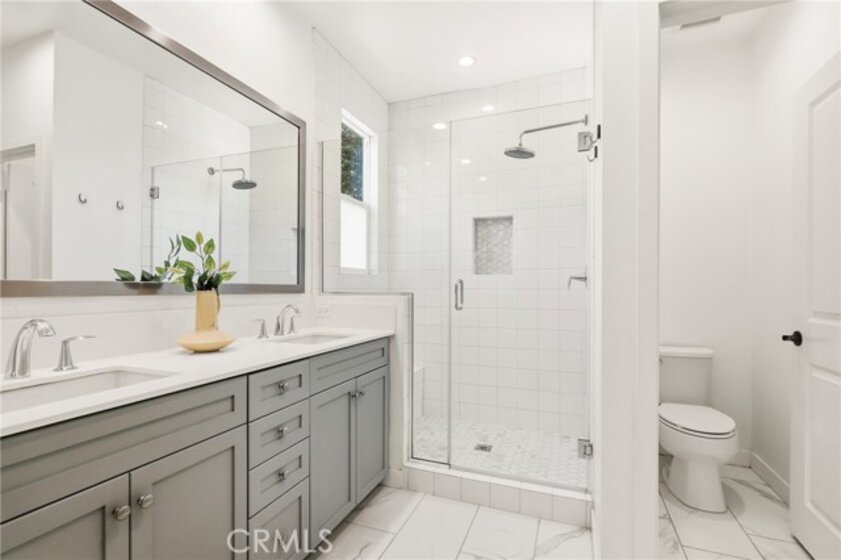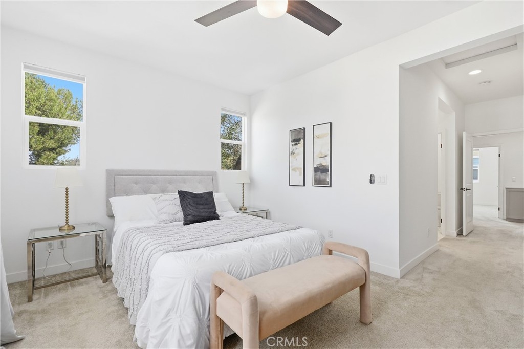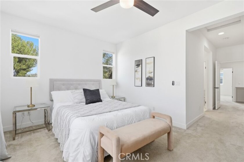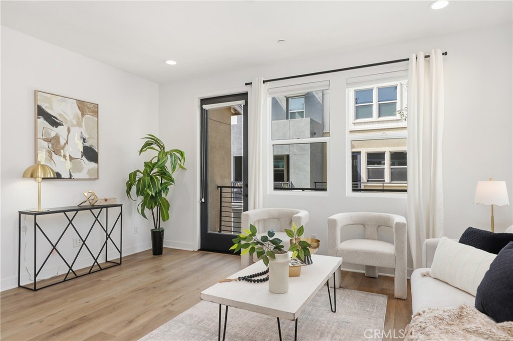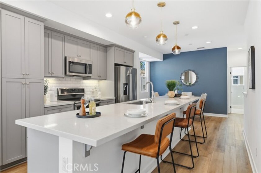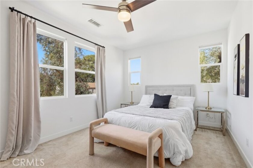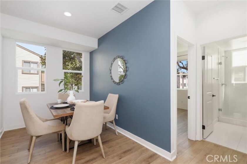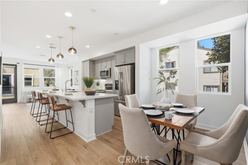 Welcome to this stunning all-electric 2018 tri-level home offering 1,748 square feet of modern living, complete with owned solar panels and thoughtful upgrades throughout. This end unit with only one shared wall is set back within the community away from street traffic. A charming and peaceful front porch and additional patio create the perfect setting for relaxing or entertaining guests. The first level features direct access to the spacious two-car garage with epoxy-coated garage floor, along with a bright and versatile bedroom—ideal for a home office or guest space—plus a bathroom. Upstairs, the main living area is filled with natural light and enhanced by recessed lighting, creating a warm and inviting atmosphere. The open-concept living and dining areas flow seamlessly and offer direct access to a private balcony—perfect for enjoying your morning coffee or hosting gatherings. The chef’s kitchen is a true highlight, featuring a large center island, sleek white countertops, 6-burner induction range, and stainless steel appliances. This level also includes an additional bedroom and full bathroom. The third floor is dedicated to comfort and privacy with two primary suites. The first primary offers plush carpeting, en-suite bathroom, and a walk-in closet. The second primary suite serves as a true retreat, complete with a dual-sink vanity, glass-enclosed shower, private water closet, and a generous walk-in closet. A convenient laundry room completes this level. Additional upgrades include EV charging capability. Residents of the desirable Harbor Collection community enjoy access to resort-style amenities, including BBQ areas, a bocce ball court, playground, and sports court. Ideally located near shopping, dining, and everyday conveniences, this move-in-ready home offers the perfect blend of comfort, style, and location. Come see this gorgeous home today - it won't last long!