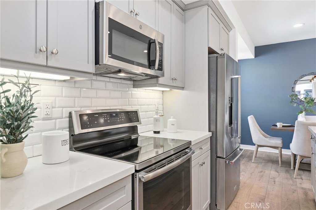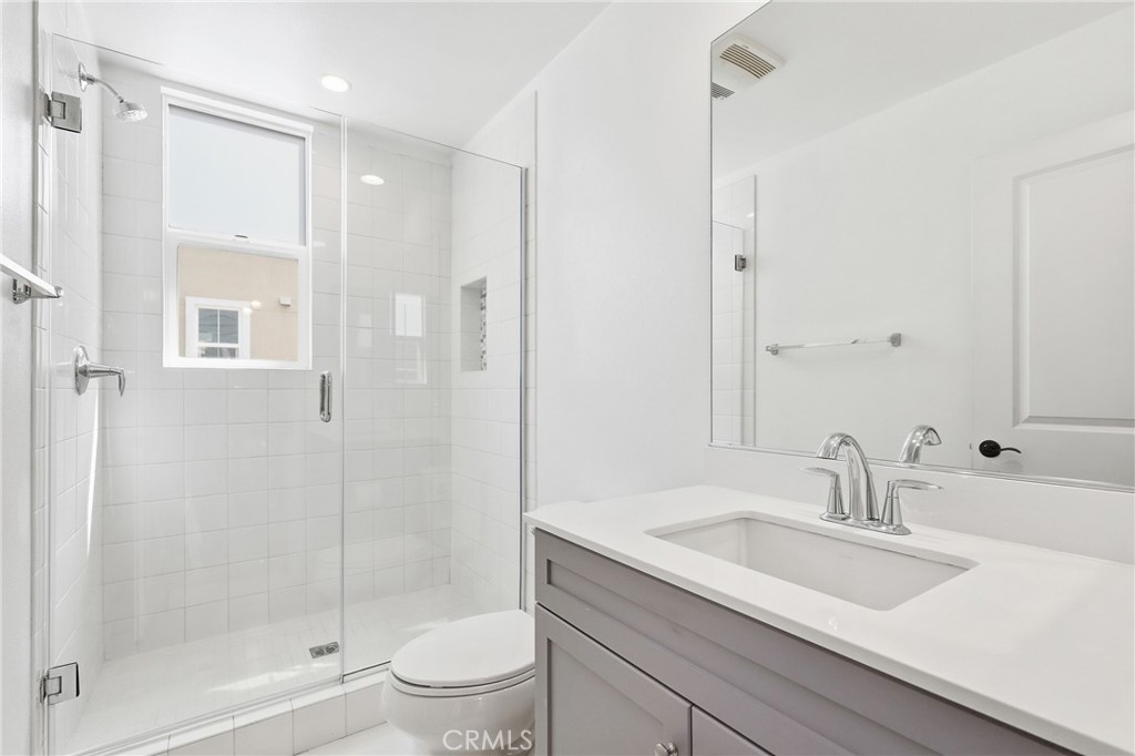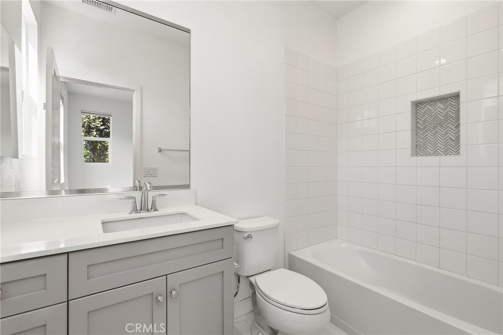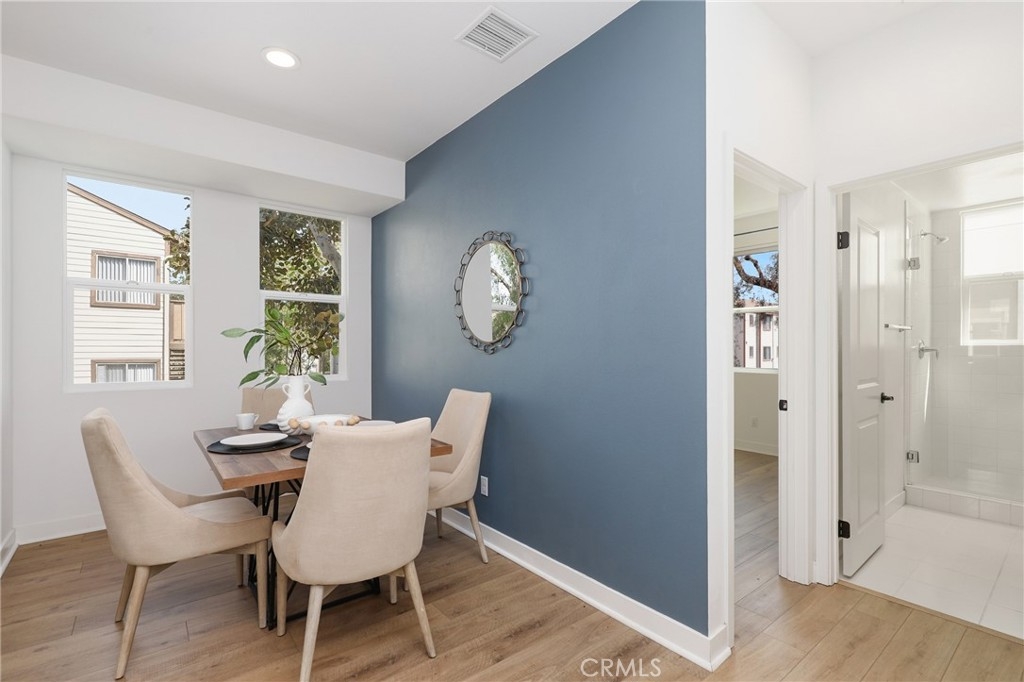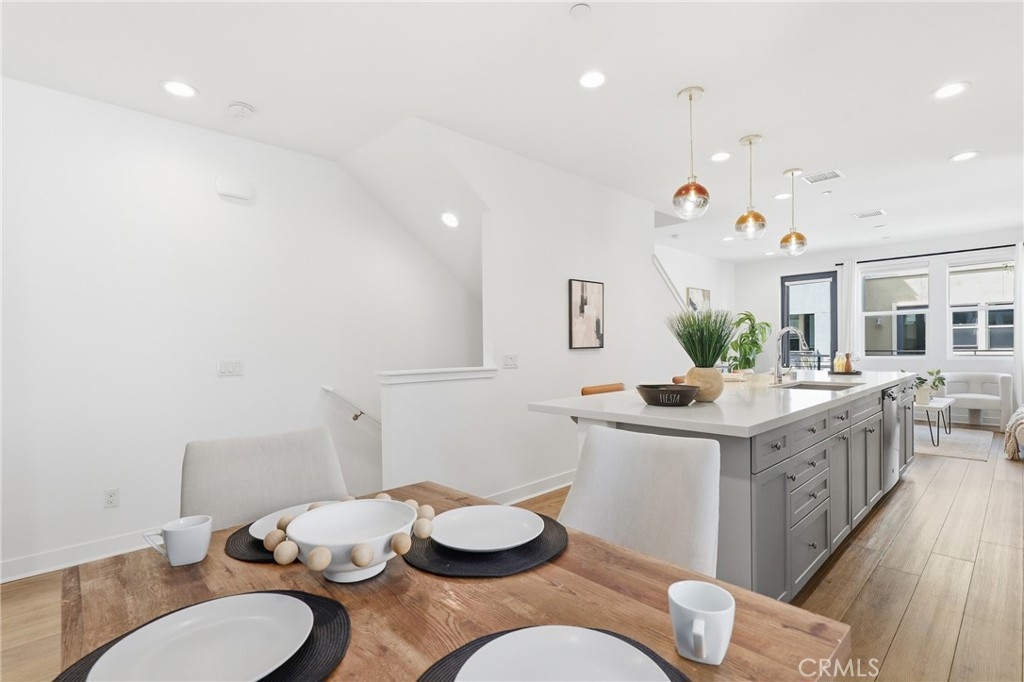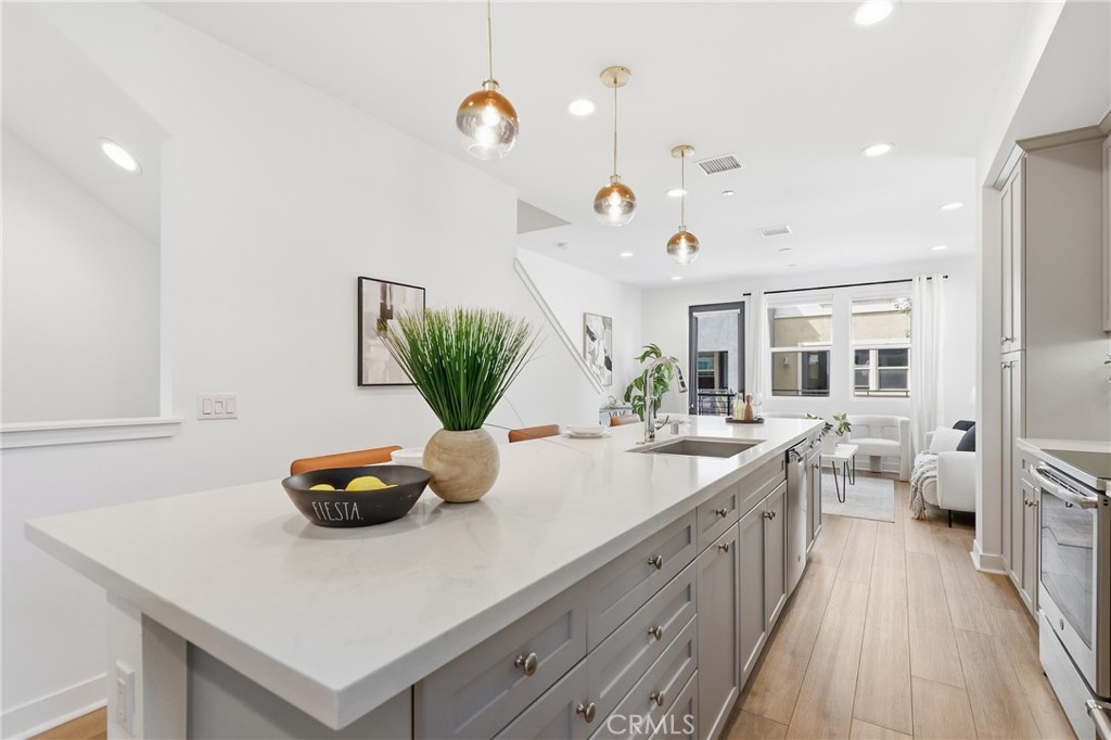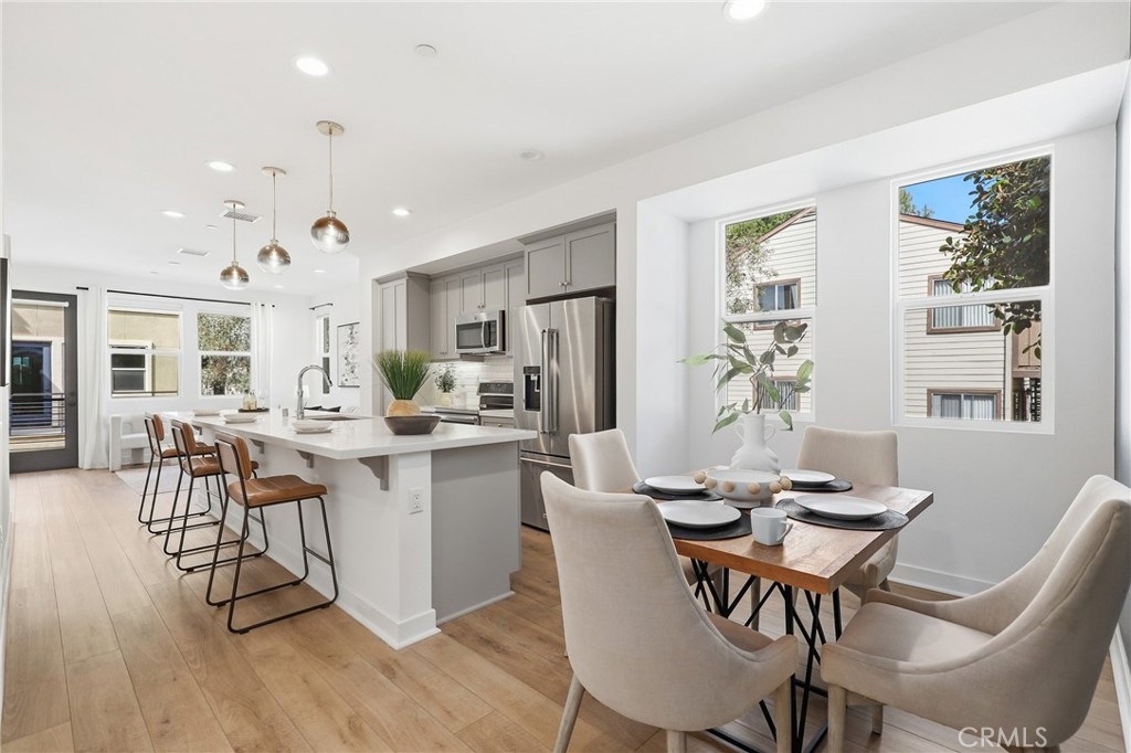 Welcome to this stunning all-electric 2018 tri-level home offering 1,748 square feet of modern living, complete with owned solar panels and thoughtful upgrades throughout. This end unit with only one shared wall is set back within the community away from street traffic. A charming and peaceful front porch and additional patio create the perfect setting for relaxing or entertaining guests. The first level features direct access to the spacious two-car garage with epoxy-coated garage floor, along with a bright and versatile bedroom—ideal for a home office or guest space—plus a bathroom. Upstairs, the main living area is filled with natural light and enhanced by recessed lighting, creating a warm and inviting atmosphere. The open-concept living and dining areas flow seamlessly and offer direct access to a private balcony—perfect for enjoying your morning coffee or hosting gatherings. The chef’s kitchen is a true highlight, featuring a large center island, sleek white countertops, 6-burner induction range, and stainless steel appliances. This level also includes an additional bedroom and full bathroom. The third floor is dedicated to comfort and privacy with two primary suites. The first primary offers plush carpeting, en-suite bathroom, and a walk-in closet. The second primary suite serves as a true retreat, complete with a dual-sink vanity, glass-enclosed shower, private water closet, and a generous walk-in closet. A convenient laundry room completes this level. Additional upgrades include EV charging capability. Residents of the desirable Harbor Collection community enjoy access to resort-style amenities, including BBQ areas, a bocce ball court, playground, and sports court. Ideally located near shopping, dining, and everyday conveniences, this move-in-ready home offers the perfect blend of comfort, style, and location. Come see this gorgeous home today - it won't last long!