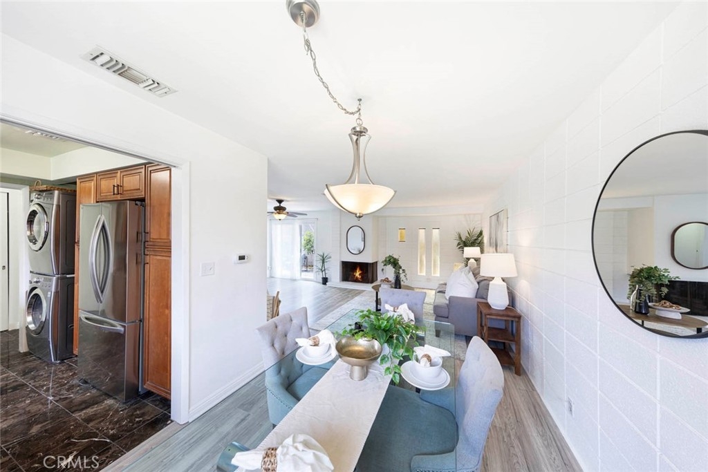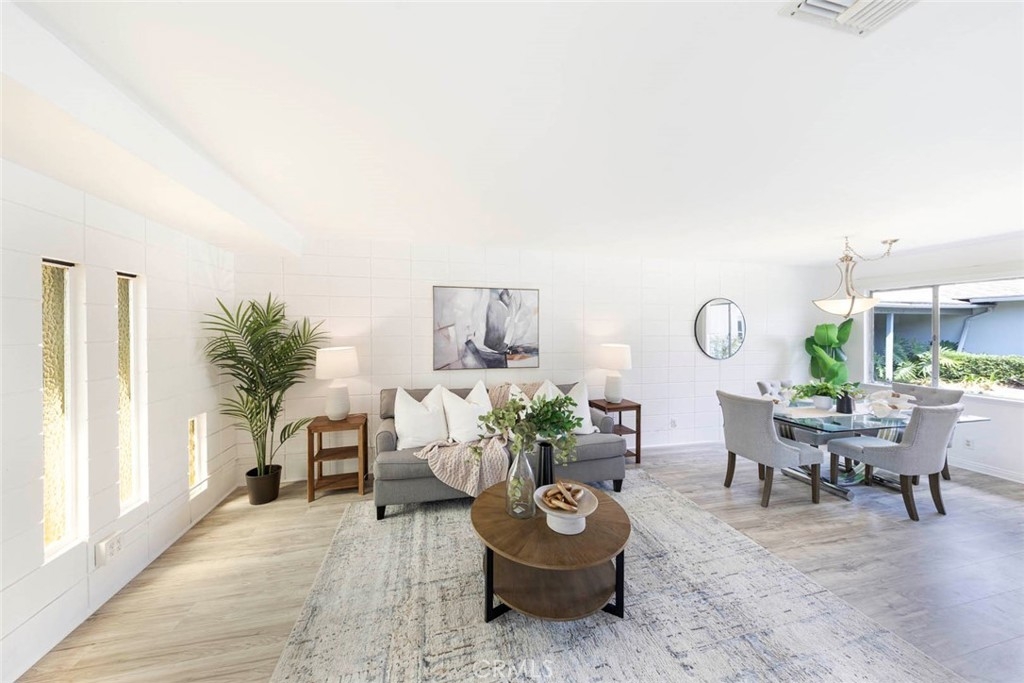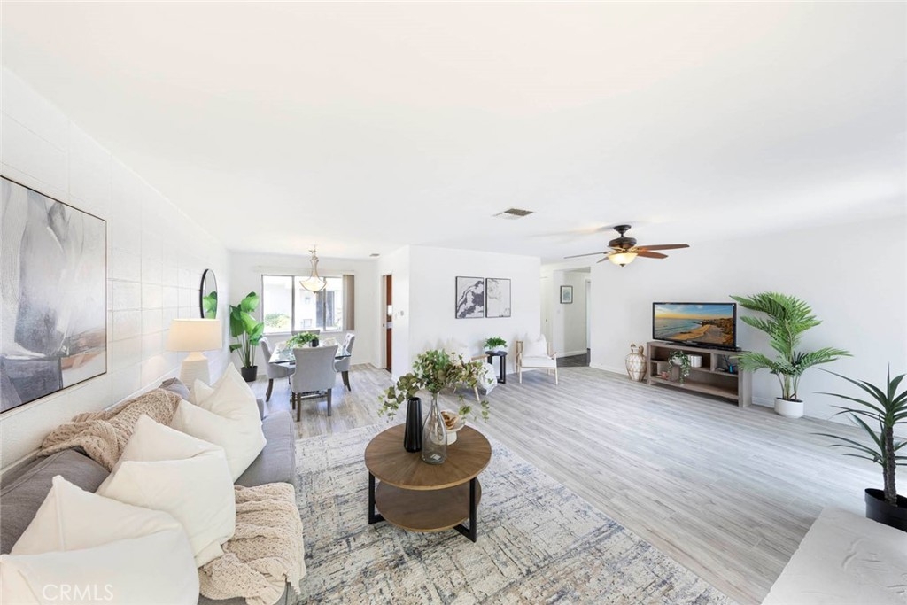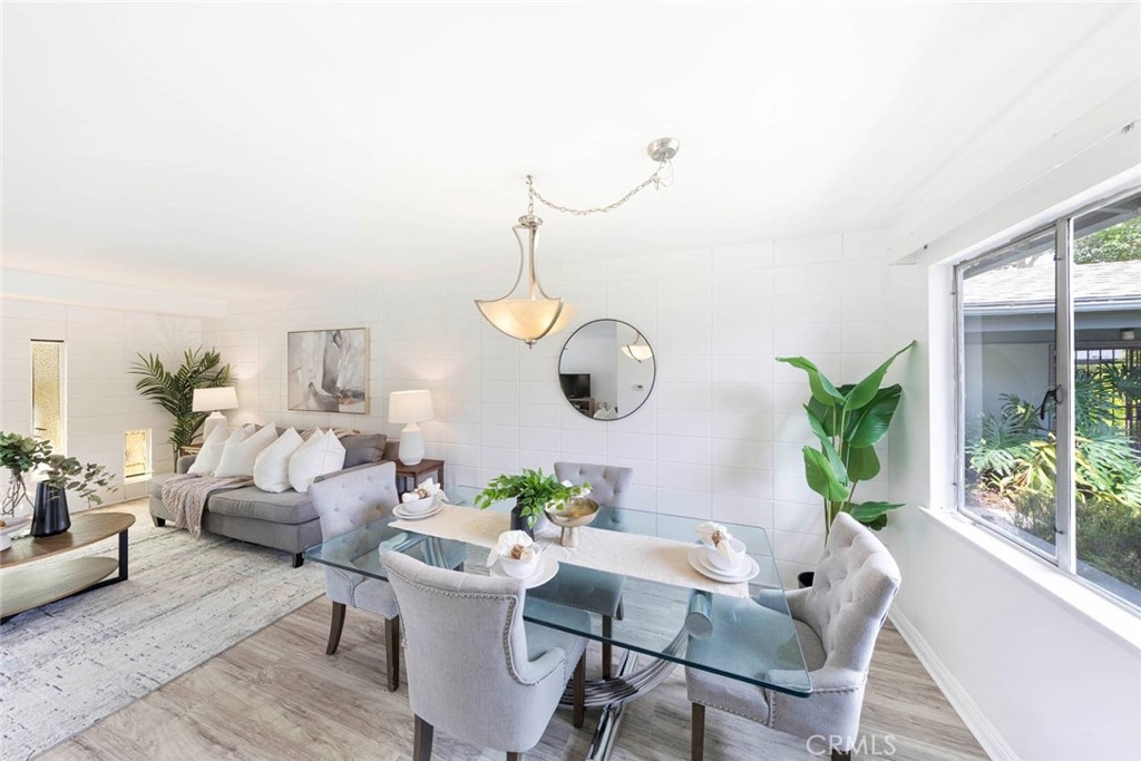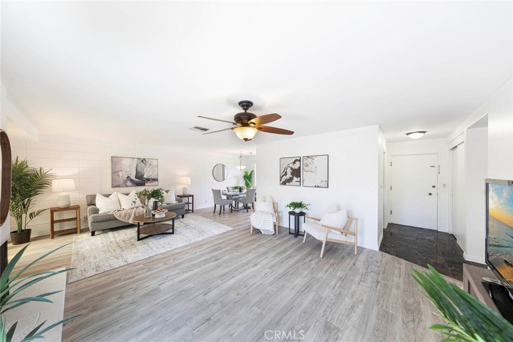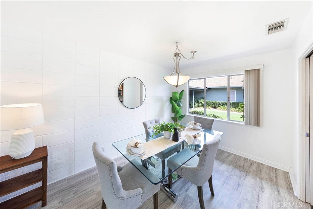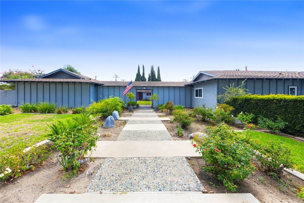 Enjoy North Tustin style living for less! This charming single-level condo offers 2 bedrooms, 2 bathrooms, and approximately 1,283 sq. ft. of beautifully updated living space—all with no steps at the entry or inside the home. Located in the highly sought-after Hewes Middle School and Foothill High School district, this home has no one above or below for added privacy. Designed with a mid-century modern vibe, the home is filled with natural light from walls of windows and sliding doors that create a bright, airy feel throughout. Inside, you’ll find thoughtful upgrades throughout. The kitchen was fully remodeled in 2012 with granite countertops, custom cabinetry, and modern appliances. An LG refrigerator (2024) is included with the home, along with a stackable washer and dryer conveniently located in the kitchen. Additional kitchen upgrades include a new exhaust fan (2020) and disposal (2024). The guest bath vanity and granite countertop were updated in 2018, while the primary bathroom was remodeled in 2019 by a licensed contractor, featuring a whirlpool tub, new plumbing, tile work, window, and exhaust fan. Electrical updates include a dedicated 220 VAC line for the tub. Additional highlights include: New laminate flooring installed August 2025 (professionally leveled, measured, and moisture-tested). Gorgeous marble flooring in kitchen and hallway. AC unit replaced in 2022 (with 5-year manufacturer warranty. Smart programmable thermostat (2022). Cozy gas and wood-burning fireplace. Garage door opener installed in 2012. Small HOA of only 4 homes. Enjoy the private backyard, perfect for outdoor dining or barbecues, with direct access to the two-car garage. A one-of-a-kind single-story condo with yard and two-car garage!
