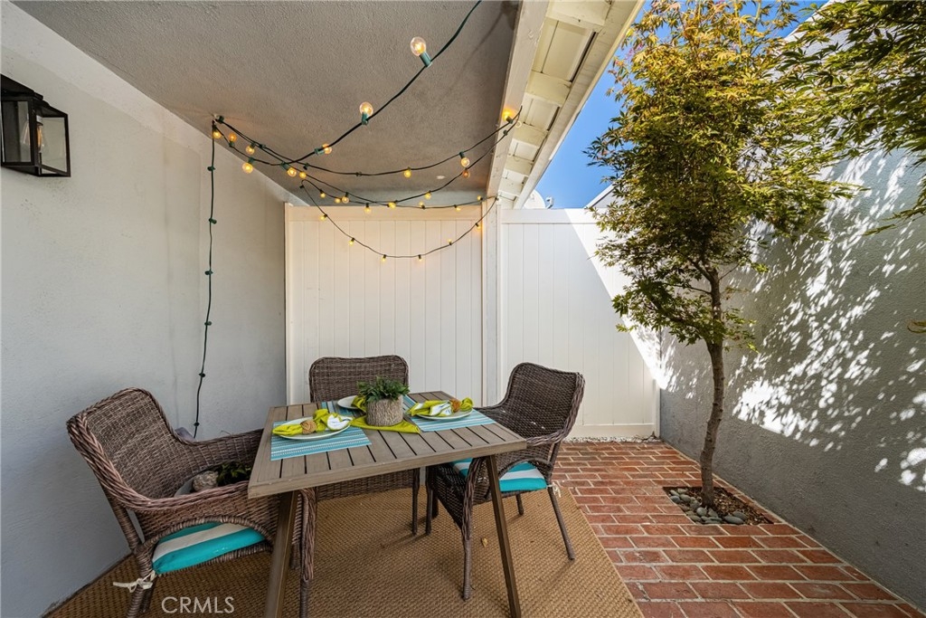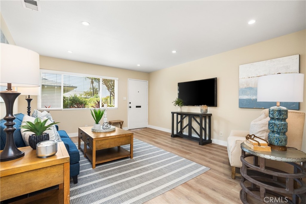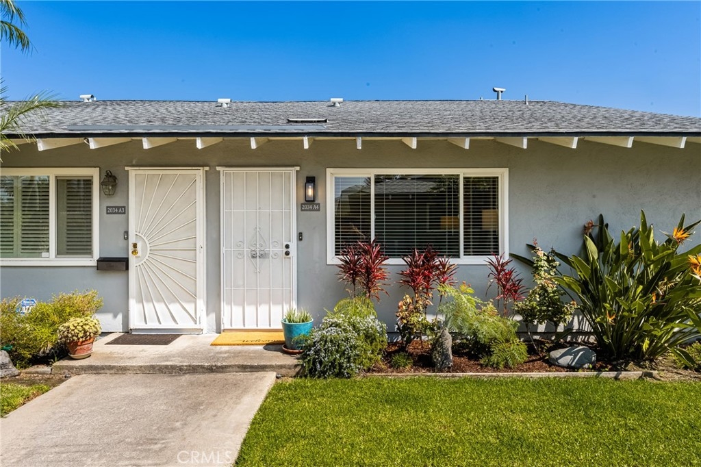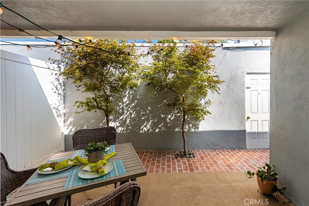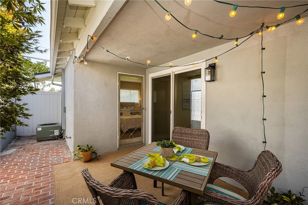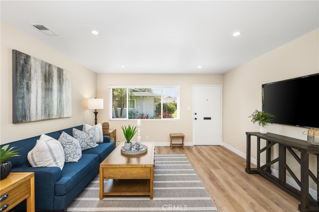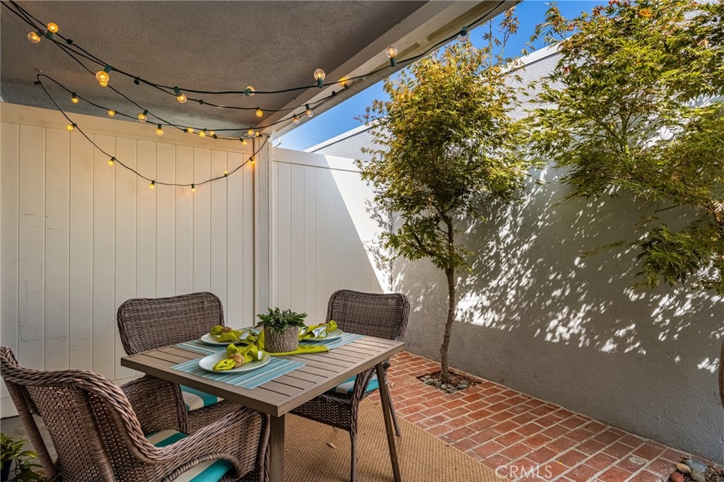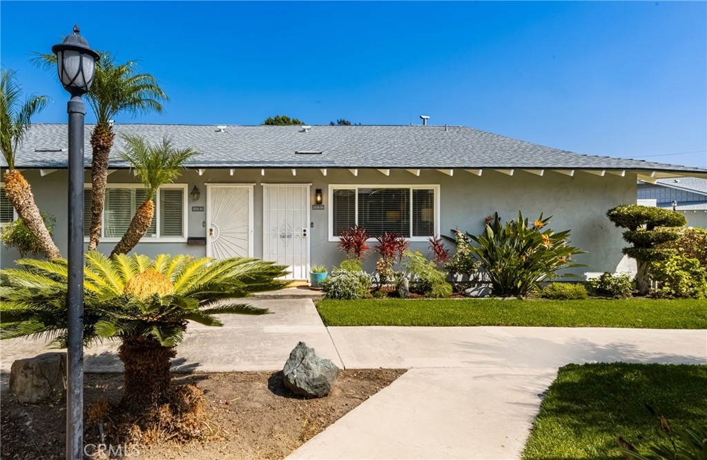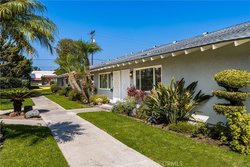 Beautifully Remodeled Single-Level Corner Condominium Discover comfort and convenience in this centrally-located and immaculate condominium within the highly regarded Tustin Unified School District. Offering freshly remodeled living space, this bright and spacious home features dual-pane windows, Brand New Hunter Douglas window shades, and a brand-new vinyl dual-pane slider, ensuring energy efficiency and year-round comfort. Both bedrooms include mirrored wardrobe closets, while the large primary bedroom features an en suite bath and direct access to a private back patio—perfect for outdoor relaxation and easy Saturday morning coffee and a good book. The charming brick and concrete patio, landscaped with gorgeous mature Japanese Maple trees provides direct access to two assigned carports for easy parking. Stay comfortable with central air conditioning and enjoy the convenience of a stackable washer and dryer located within the unit, along with additional laundry rooms on the property for your use. The dining room offers a cozy fireplace, while the designer inspired and thoughtfully planned accents in this kitchen give it a contemporary luxury look and is equipped with a large skylight, quartz countertops, a breakfast bar, a stainless steel farmhouse inspired sink and electric appliances. Both bathrooms are also updated with sleek quartz countertops. Brand new vinyl flooring and recessed lighting throughout completes the ambiance of this spectacular home. Community amenities include a sparkling pool, clubhouse, and outdoor barbecue area—ideal for leisure and entertaining. This beautifully updated, light-filled pristine home is move-in ready and combines style, comfort, and modern convenience, all in a prime location close to top schools, shopping, and dining.