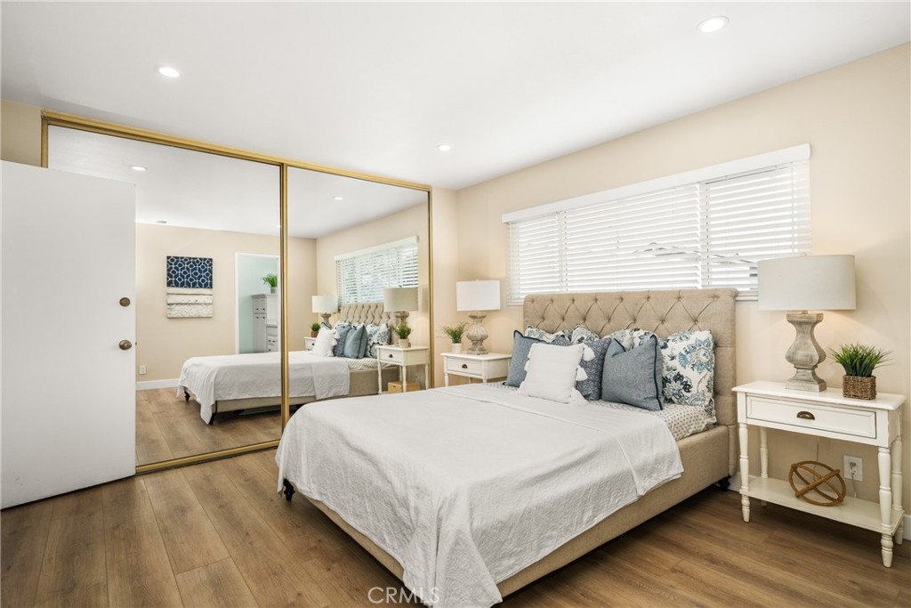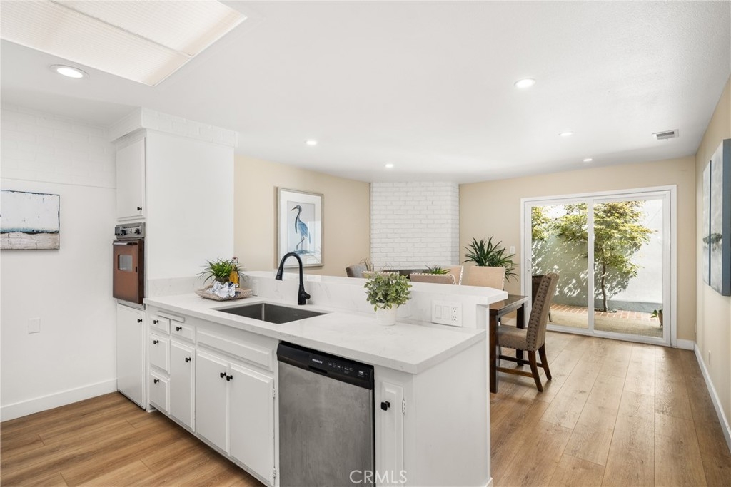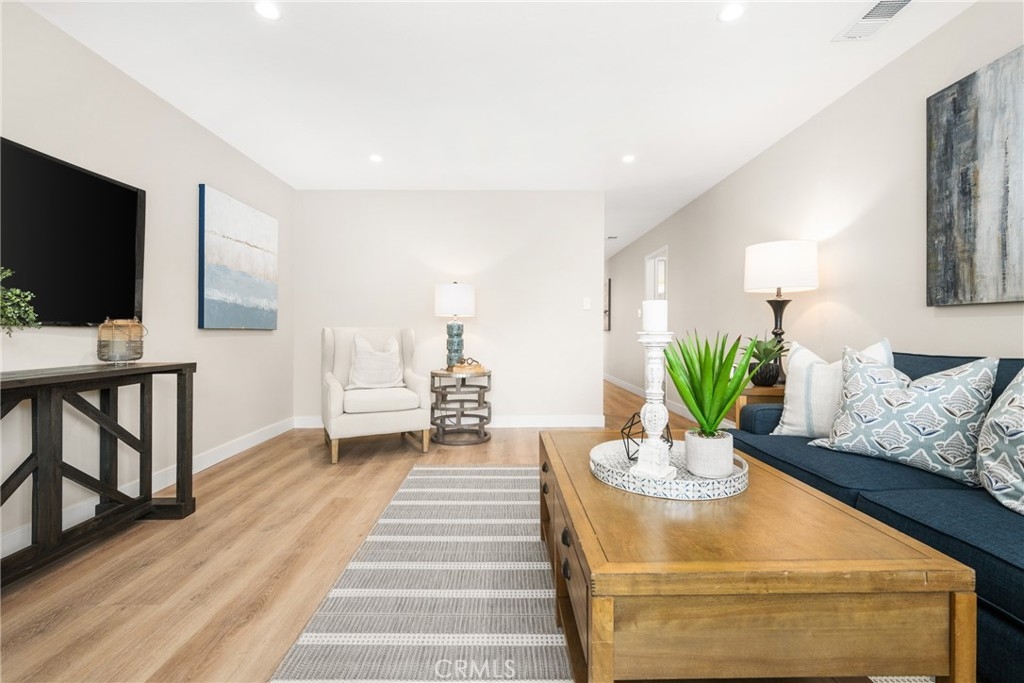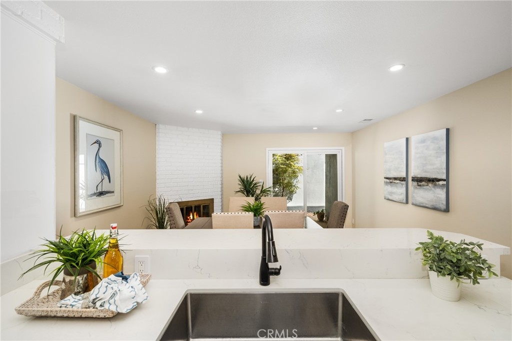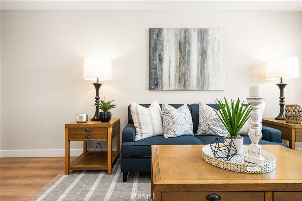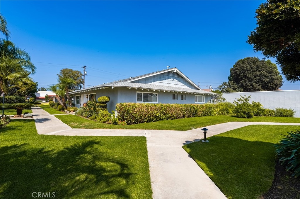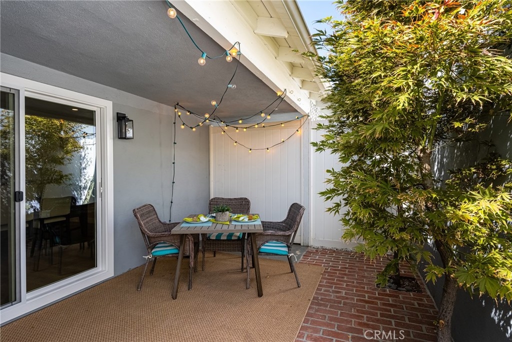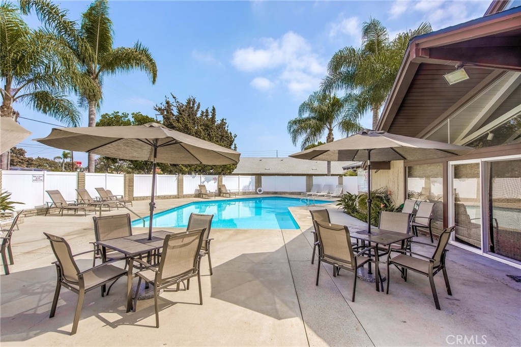 Beautifully Remodeled Single-Level Corner Condominium Discover comfort and convenience in this centrally-located and immaculate condominium within the highly regarded Tustin Unified School District. Offering freshly remodeled living space, this bright and spacious home features dual-pane windows, Brand New Hunter Douglas window shades, and a brand-new vinyl dual-pane slider, ensuring energy efficiency and year-round comfort. Both bedrooms include mirrored wardrobe closets, while the large primary bedroom features an en suite bath and direct access to a private back patio—perfect for outdoor relaxation and easy Saturday morning coffee and a good book. The charming brick and concrete patio, landscaped with gorgeous mature Japanese Maple trees provides direct access to two assigned carports for easy parking. Stay comfortable with central air conditioning and enjoy the convenience of a stackable washer and dryer located within the unit, along with additional laundry rooms on the property for your use. The dining room offers a cozy fireplace, while the designer inspired and thoughtfully planned accents in this kitchen give it a contemporary luxury look and is equipped with a large skylight, quartz countertops, a breakfast bar, a stainless steel farmhouse inspired sink and electric appliances. Both bathrooms are also updated with sleek quartz countertops. Brand new vinyl flooring and recessed lighting throughout completes the ambiance of this spectacular home. Community amenities include a sparkling pool, clubhouse, and outdoor barbecue area—ideal for leisure and entertaining. This beautifully updated, light-filled pristine home is move-in ready and combines style, comfort, and modern convenience, all in a prime location close to top schools, shopping, and dining.