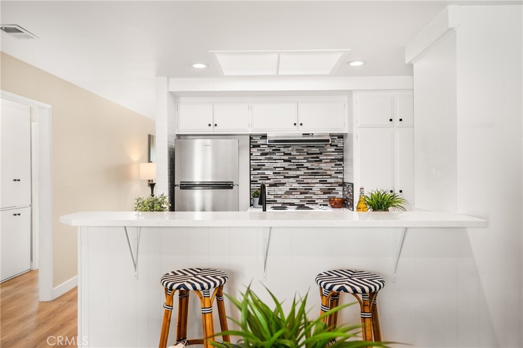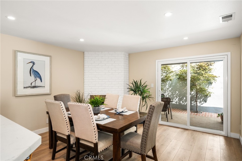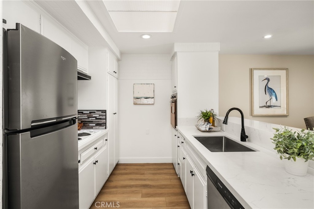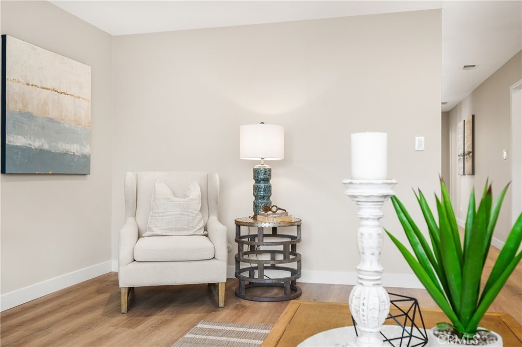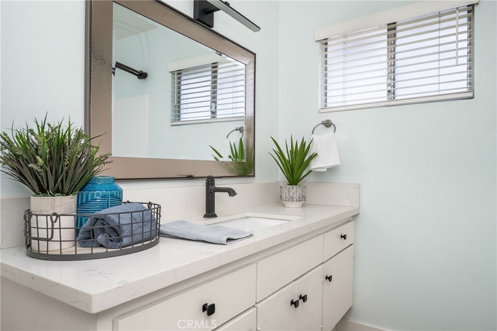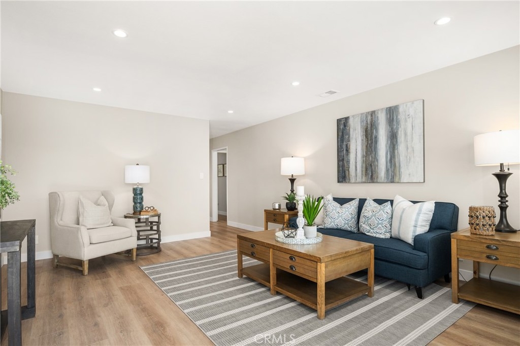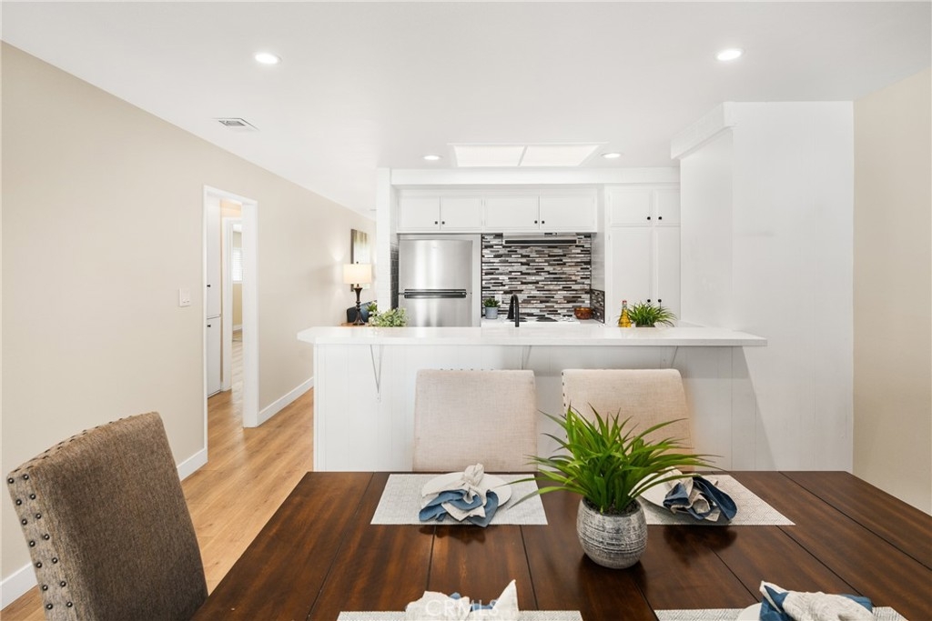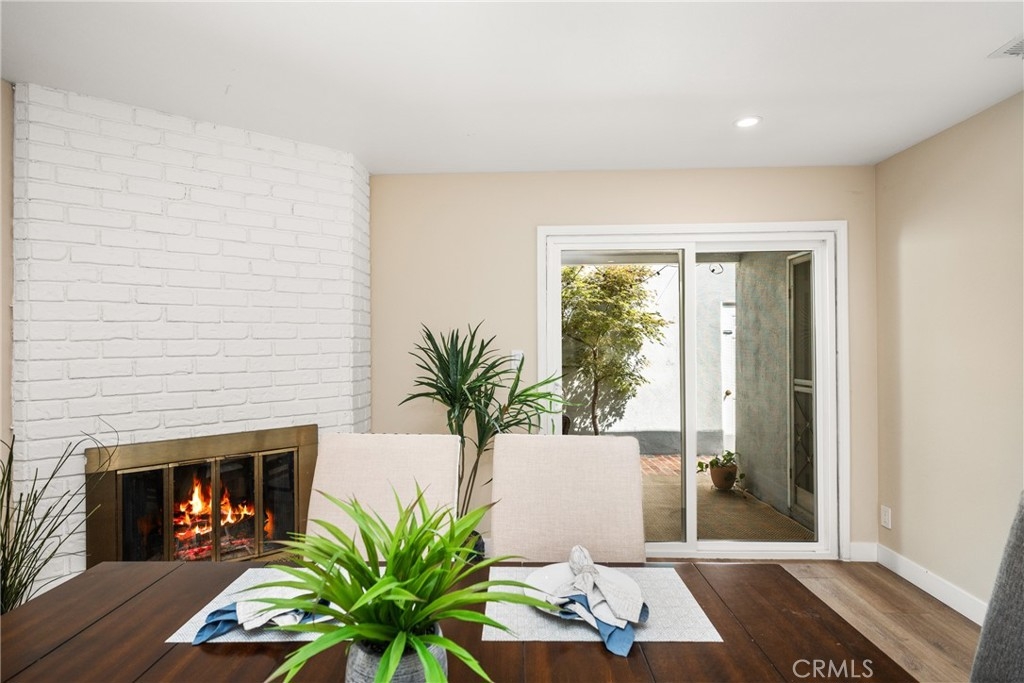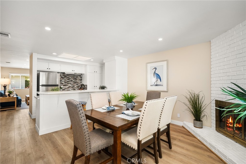 Beautifully Remodeled Single-Level Corner Condominium Discover comfort and convenience in this centrally-located and immaculate condominium within the highly regarded Tustin Unified School District. Offering freshly remodeled living space, this bright and spacious home features dual-pane windows, Brand New Hunter Douglas window shades, and a brand-new vinyl dual-pane slider, ensuring energy efficiency and year-round comfort. Both bedrooms include mirrored wardrobe closets, while the large primary bedroom features an en suite bath and direct access to a private back patio—perfect for outdoor relaxation and easy Saturday morning coffee and a good book. The charming brick and concrete patio, landscaped with gorgeous mature Japanese Maple trees provides direct access to two assigned carports for easy parking. Stay comfortable with central air conditioning and enjoy the convenience of a stackable washer and dryer located within the unit, along with additional laundry rooms on the property for your use. The dining room offers a cozy fireplace, while the designer inspired and thoughtfully planned accents in this kitchen give it a contemporary luxury look and is equipped with a large skylight, quartz countertops, a breakfast bar, a stainless steel farmhouse inspired sink and electric appliances. Both bathrooms are also updated with sleek quartz countertops. Brand new vinyl flooring and recessed lighting throughout completes the ambiance of this spectacular home. Community amenities include a sparkling pool, clubhouse, and outdoor barbecue area—ideal for leisure and entertaining. This beautifully updated, light-filled pristine home is move-in ready and combines style, comfort, and modern convenience, all in a prime location close to top schools, shopping, and dining.