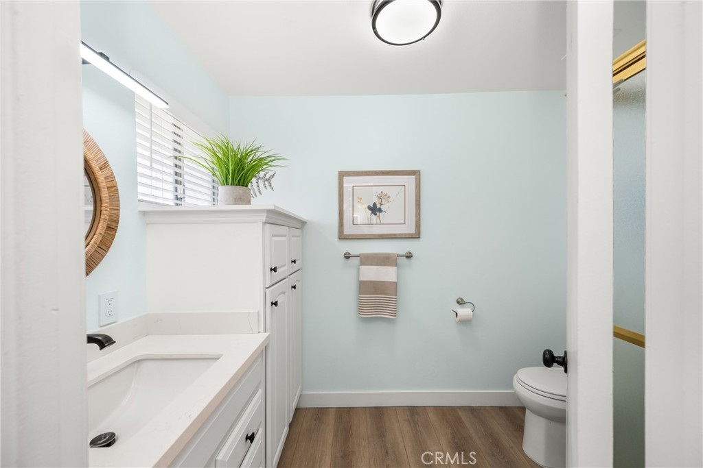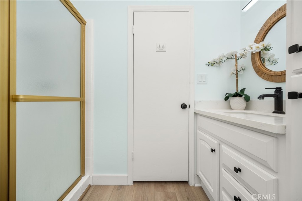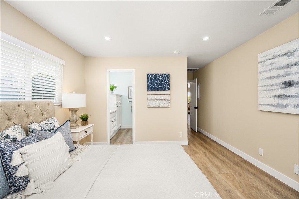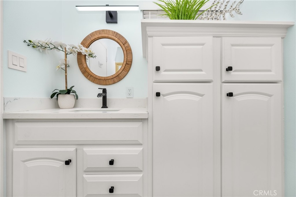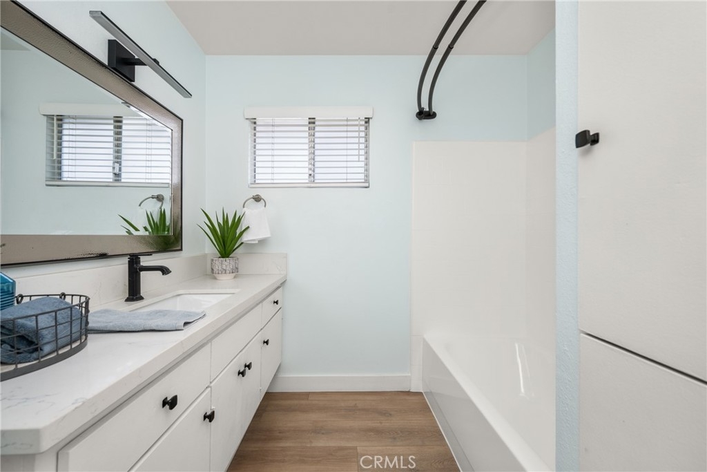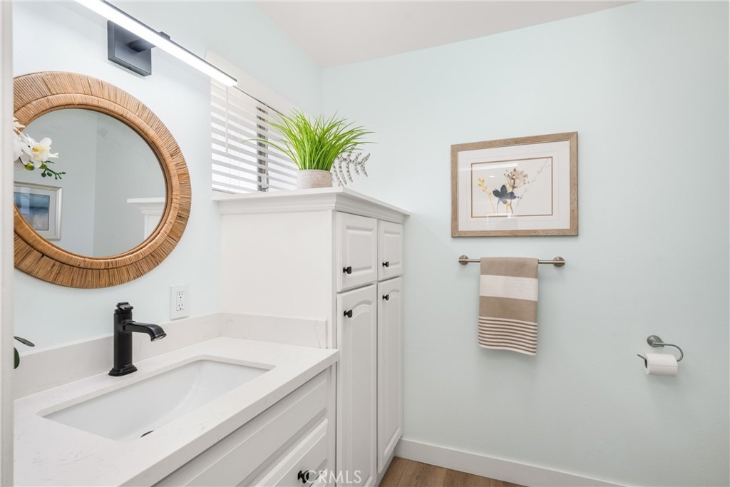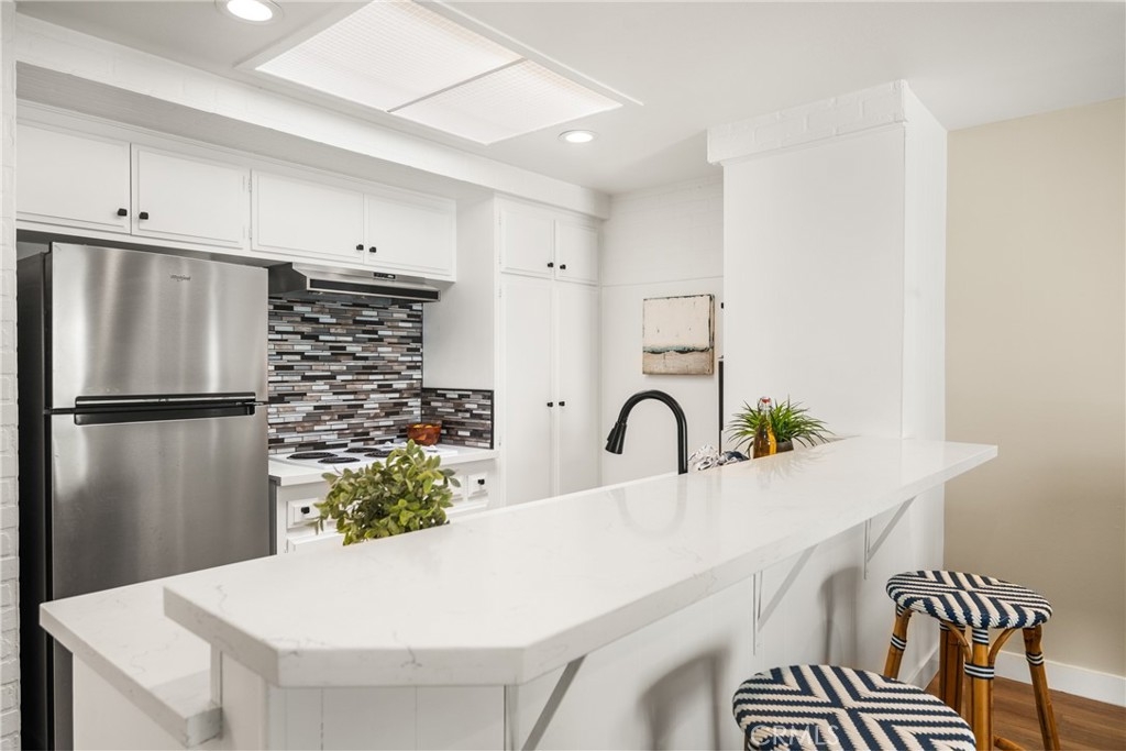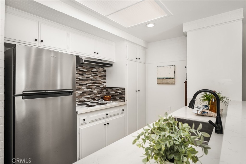Beautifully Remodeled Single-Level Corner Condominium Discover comfort and convenience in this centrally-located and immaculate condominium within the highly regarded Tustin Unified School District. Offering freshly remodeled living space, this bright and spacious home features dual-pane windows, Brand New Hunter Douglas window shades, and a brand-new vinyl dual-pane slider, ensuring energy efficiency and year-round comfort. Both bedrooms include mirrored wardrobe closets, while the large primary bedroom features an en suite bath and direct access to a private back patio—perfect for outdoor relaxation and easy Saturday morning coffee and a good book. The charming brick and concrete patio, landscaped with gorgeous mature Japanese Maple trees provides direct access to two assigned carports for easy parking. Stay comfortable with central air conditioning and enjoy the convenience of a stackable washer and dryer located within the unit, along with additional laundry rooms on the property for your use. The dining room offers a cozy fireplace, while the designer inspired and thoughtfully planned accents in this kitchen give it a contemporary luxury look and is equipped with a large skylight, quartz countertops, a breakfast bar, a stainless steel farmhouse inspired sink and electric appliances. Both bathrooms are also updated with sleek quartz countertops. Brand new vinyl flooring and recessed lighting throughout completes the ambiance of this spectacular home. Community amenities include a sparkling pool, clubhouse, and outdoor barbecue area—ideal for leisure and entertaining. This beautifully updated, light-filled pristine home is move-in ready and combines style, comfort, and modern convenience, all in a prime location close to top schools, shopping, and dining.