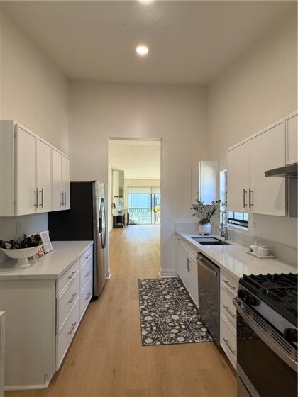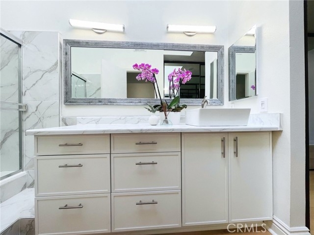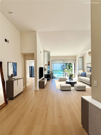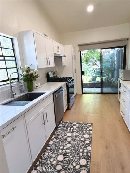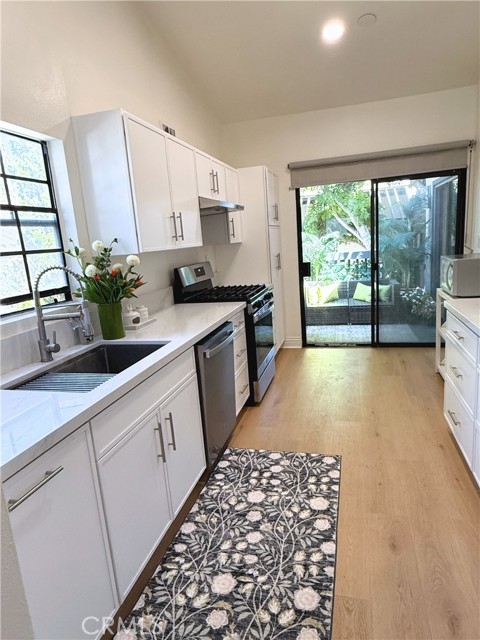 Completely newly remodeled, turnkey home in the prestigious gated Woodlake community. Rare opportunity to own a top level (no one above), end-unit - this is a Premium private location! Adjacent to world renowned South Coast Plaza, Segerstrom Performing Arts Center and central to OC. Enter this open floor plan home to soaring ceilings, wide plank laminate flooring, fireplace with custom fire glass, and new recessed LED lighting throughout. Thoughtfully designed with pride of ownership. The remodeled contemporary kitchen features all new stainless appliances, custom soft-close cabinets with built-in organizers, and elegant Prada Gold quartz counters. The kitchen nook area opens up to a serene patio deck great for relaxation, accessible to the second bedroom as well. The stunning Master Bathroom features a spacious vanity area with lots of storage, custom cabinets built with extra drawers, elegant lighting fixtures, a sunken tub and shower, and skylight providing beautiful natural light. The remodeled second bathroom features a new vanity, new mirror, quartz countertop, and a walk-in shower. The spacious living room with vaulted ceilings opens up to a large, gorgeous wood deck expanding the living space, perfect for entertaining or relaxing with a tranquil stream below. Ample storage throughout including an attic. Two assigned carport spaces next to the building and plenty of guest parking. Ideal location with ponds, water features, waterfalls, and mature trees throughout the community. HOA amenities include: pool, spa, maintenance, water, trash, termite and outside electricity. Hurry to see this beautiful, turnkey home!