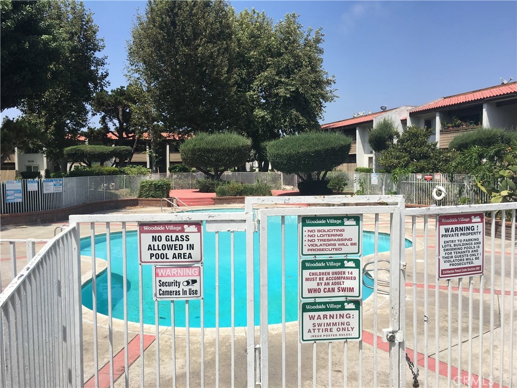 Woodside Village Condominium. End and Ground Floor unit. Great location near community Pool and Laundry room. Good size Living room with large sliding door that leads to enclosed patio. Dining area with ceiling fan. Kitchen with granite counter top, counter bar for stools, dishwasher, gas stoves, white cabinets. Main bedroom with full size bathroom, small area to the side great for office desk or sitting area. Nice size second bedroom across from full size bathroom. Laminated wood flooring through out. Central AC. 1 parking space in carport and 1 permit to park the 2nd car. Low HOA covers Water, Trash, Gas, Sewage.