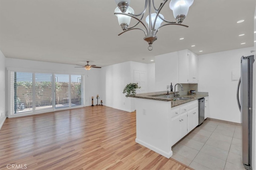 This updated bottom-level corner condo offers privacy and natural light throughout. The spacious open-concept layout includes modern finishes and floor-to-ceiling mirrors. The kitchen features upgraded granite countertops and stainless-steel appliances, including a refrigerator, microwave, stove, and dishwasher. Interior features include freshly painted walls, laminate flooring, and matching tile in the bathrooms and entry. The unit also includes two ceiling fans, custom window treatments, dual-pane windows, and custom shutters with a matching patio slider shutter. Bathrooms are updated with matching tile, granite countertops, glass shower doors, new cabinets, and modern hardware. Both bedrooms feature floor-to-ceiling mirrors. A private patio overlooks the landscaped community greenbelt. The unit includes one assigned carport parking space located close to the condo. Community amenities include gated entry with remote access and security patrol, ample guest parking, landscaped greenbelts, mature trees, and walking paths. Multiple swimming pools and a clubhouse are currently under renovation. Additional amenities include a spa with picnic area, carport storage lockers, and an on-site laundry facility near the unit. HOA dues include water, trash, and exterior maintenance. The community maintains active resident involvement and neighborhood watch programs in coordination with the Santa Ana Police Department. This property is located near major freeways, including the 405, 55, and 5, and offers convenient access to John Wayne Airport, Bowers Museum, Discovery Cube, local parks, beaches, and top-rated schools. It is less than one mile from South Coast Plaza. The surrounding area is experiencing major redevelopment, including Related Group’s 44-acre “Related Bristol” project and Segerstrom Group’s 13-acre “The Village Santa Ana,”.