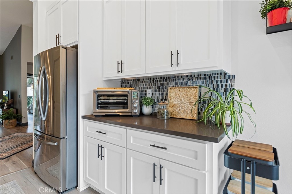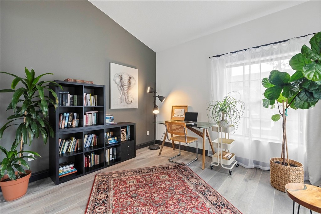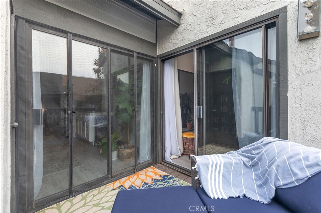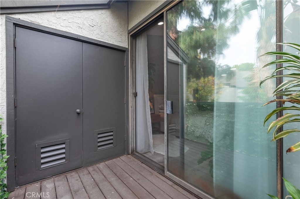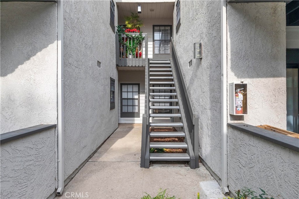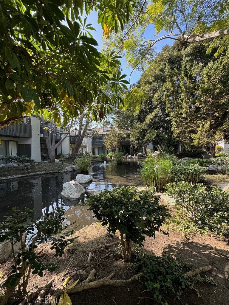 The BEST LOCATION IN THE COMPLEX - Resort-like with loads of privacy in this upgraded UPPER LEVEL location, in the gated community of Woodlake. This TURN-KEY, one level HOME features an Open Floor plan with a remodeled Kitchen, newer Cabinets, Sink, and Quartz Counter-top. The Main Living Area includes a spacious Dining Area and Open Living Room with Designer paint and Fireplace. There is pristine Vinyl Wood flooring throughout, with High Ceilings in the Living, Dining, Master Bedroom and Kitchen areas. TWO separate Private Patio Spaces, 1 at the Rear adjacent to the Living Room, Private and Spacious, overlooking the Main Water feature that is enveloped with Lush Greenery. The other Patio has door access from the Kitchen and Slider access from the 2nd Bedroom. The Master Bedroom Suite has lots of Light, multiple closets, en suite Bathroom with a walk-out patio, that is next to the enclosed Laundry Closet. The Second Bedroom which is on the opposite side of the condo, adjacent to the Kitchen with Hallway accessed to a Full Bathroom. Pull-down Stairs in Hallway leads to BONUS storage area. This absolutely COZY HOME has 2 Carport Parking Spaces, no. 185 and 84. The Cluster Mailbox is located in the building next to the Carport. The complex is located in the midst of the South Coast Metro area, so it is ONLY a 5-Min drive to Schools, Shopping and Freeway access.