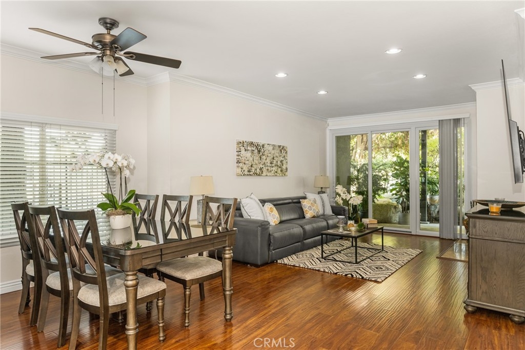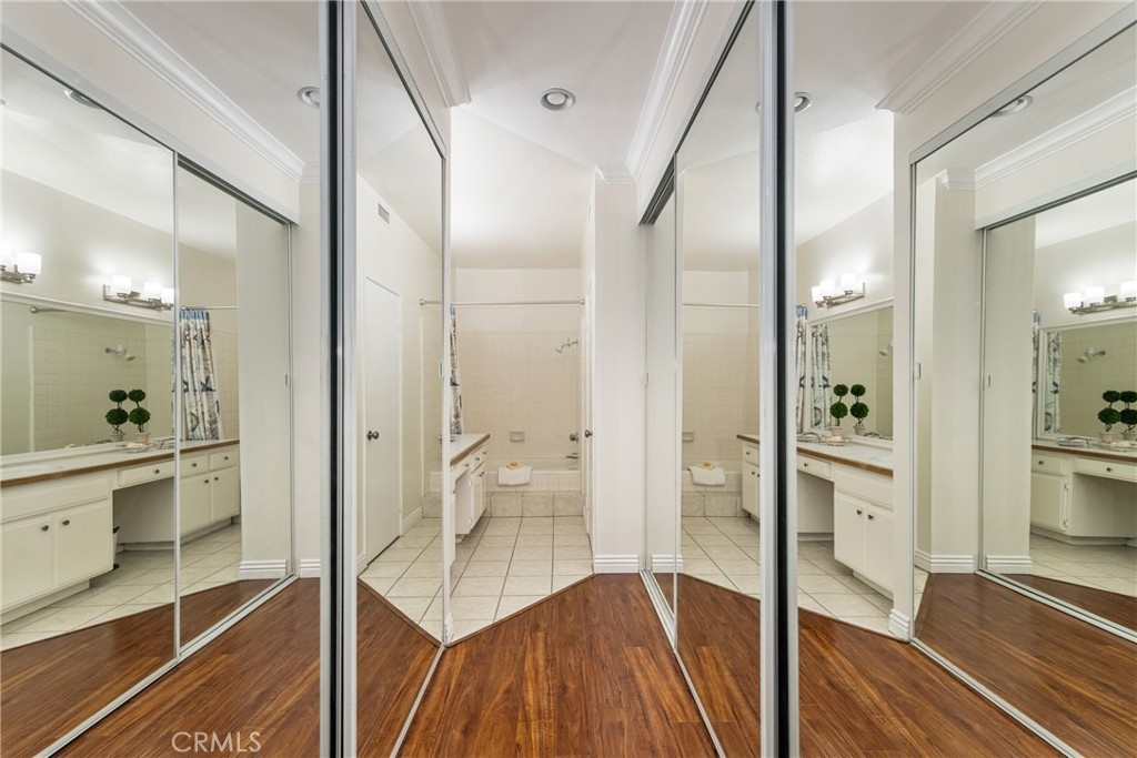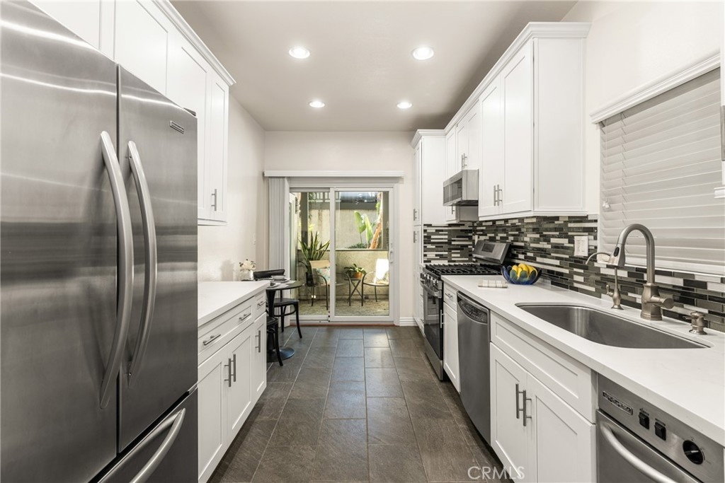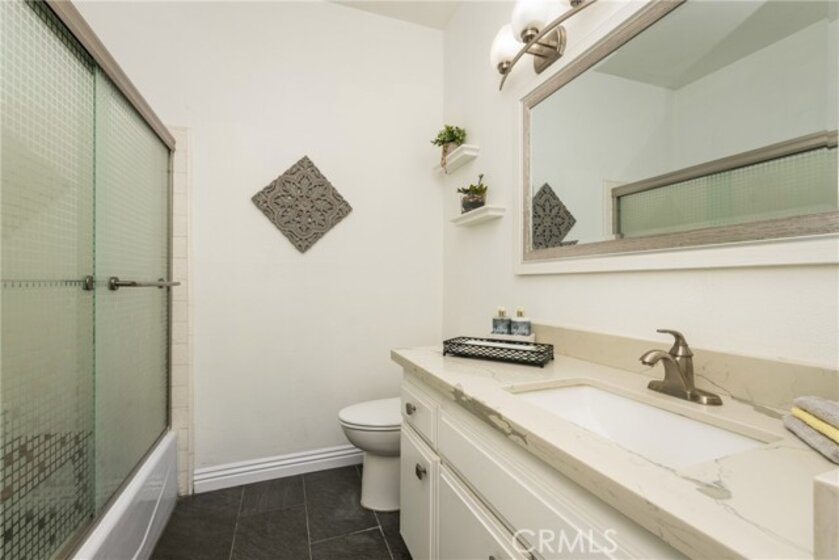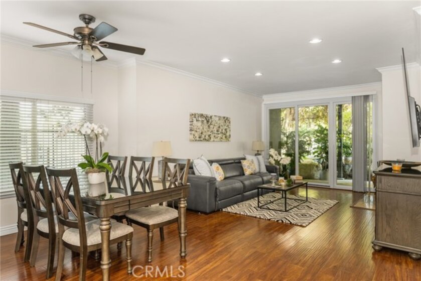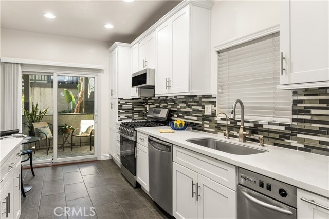 Highly renovated ground-level end unit in the prestigious gated community of Woodlake. This rare offering features two private patios and a premium, exceptionally private location. Step inside to an open floor plan with soaring ceilings, wide-plank laminate flooring, crown molding, recessed lighting, and a cozy fireplace. Brand-new, high-end Renewal by Andersen windows and sliding doors fill the home with natural light while enhancing energy efficiency. The remodeled kitchen includes stainless steel appliances, custom soft-close cabinetry, and elegant quartz countertops. A charming breakfast nook opens to a tranquil private patio—also accessible from the second bedroom—creating an ideal space to unwind. The beautiful primary bathroom offers a spacious vanity with abundant storage, a sunken tub and shower, and recessed lighting. The second bathroom is also a full bathroom with a tub and shower combo. The generous living room, with its impressive ceiling height, extends to a large private side patio overlooking a serene stream and waterfall—perfect for entertaining or everyday relaxation. A washer–dryer closet and an additional exterior storage closet provide exceptional convenience. This home includes one assigned carport, one assigned uncovered parking space adjacent to the building, and ample guest parking. The community is known for its lush landscaping, mature trees, ponds, waterfalls, and peaceful water features. HOA amenities include a pool, spa, exterior maintenance, water, trash, termite service, and exterior electricity. A beautifully updated home—thoughtfully designed and meticulously maintained. Located moments from world-renowned South Coast Plaza, the Segerstrom Center for the Arts, and centrally positioned within Orange County for easy access to major freeways, beaches, and shopping. This special home shows true pride of ownership—come see it before it slips away.