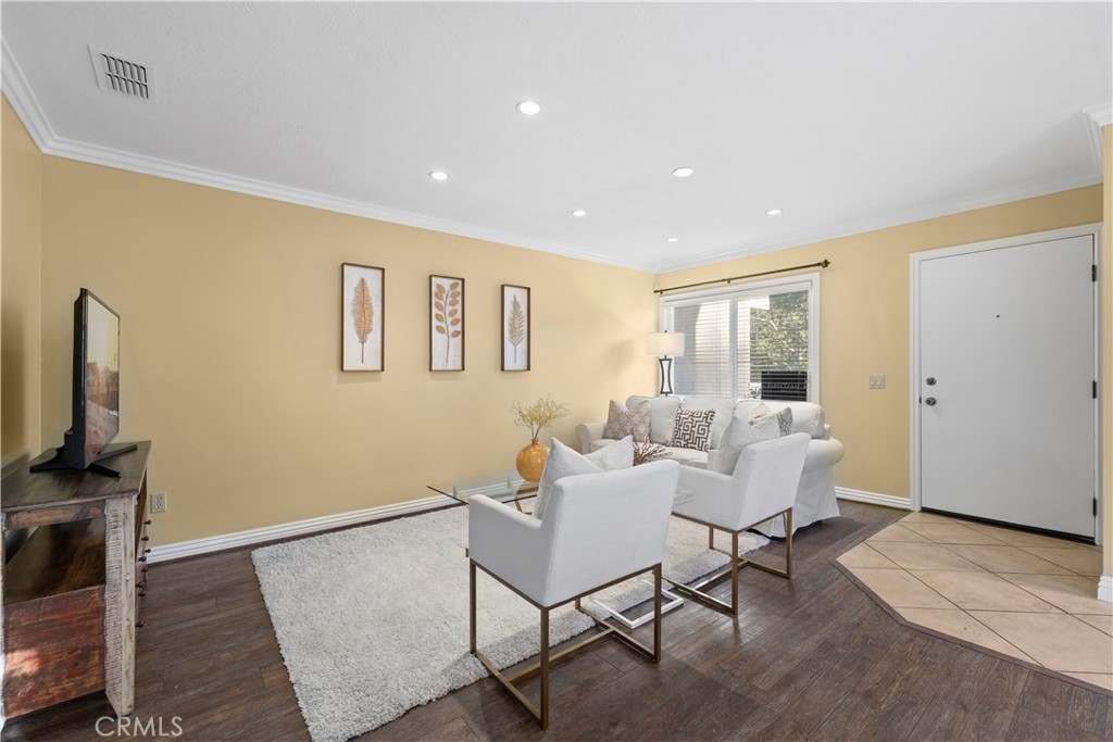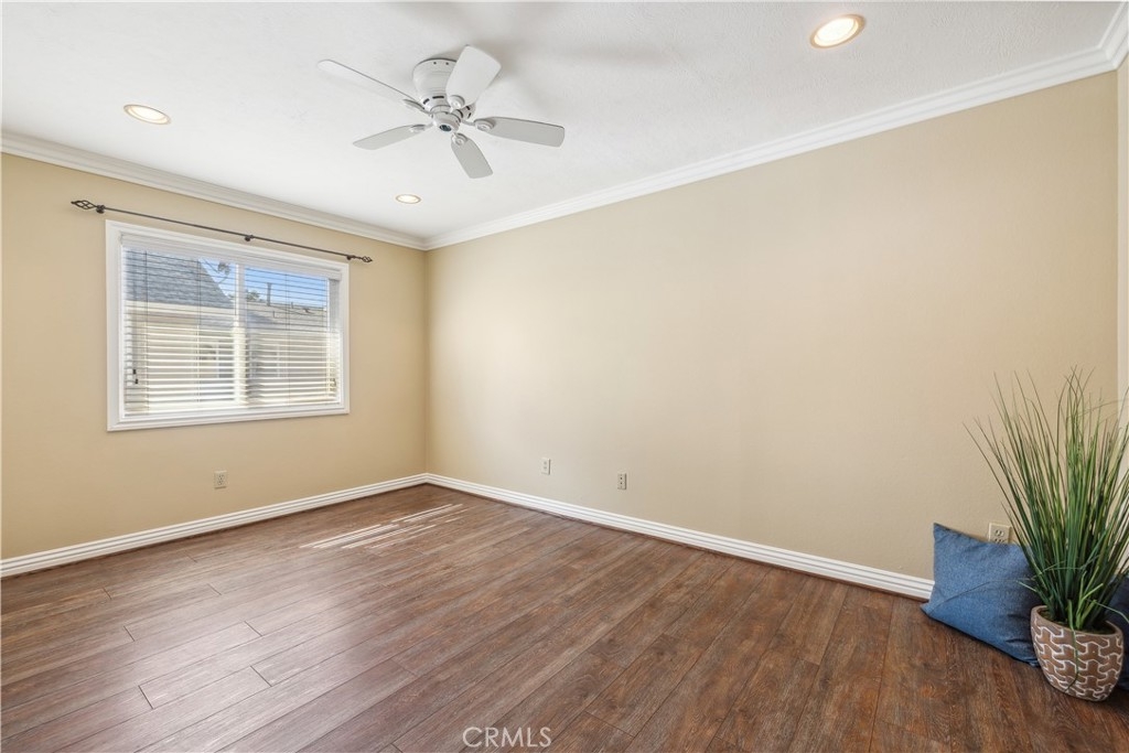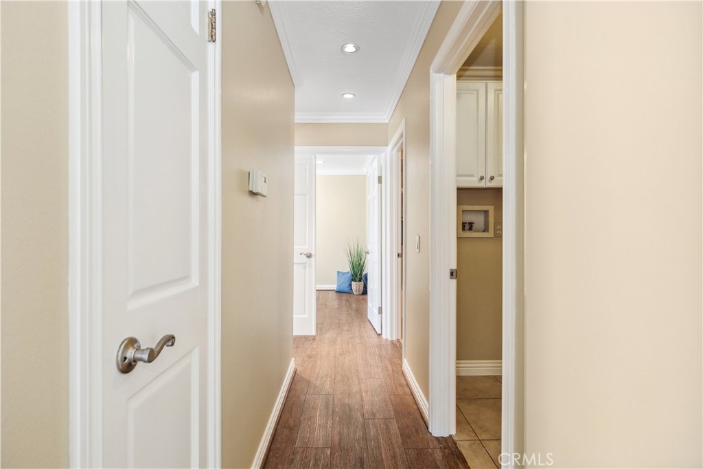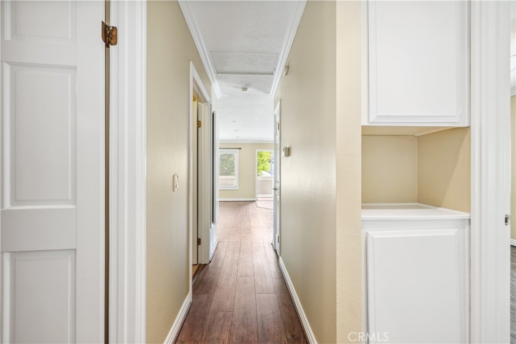 Fabulous starter home or investor opportunity awaits you. Light and bright Single level upstairs 2 bedroom 1 bathroom with a separate laundry room. Remodeled kitchen with a view of the community, plenty of counter space with granite counters and tile flooring. Good size bedrooms with ceiling fans and a walk in closet in the primary bedroom. Vinyl wood flooring throughout most of the home, Window shutters and crown molding throughout, private patio with room to soak in the sun. Separate one car garage with plenty of storage. Lovely community offers Pool, spa/hot tub.