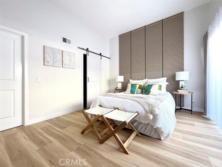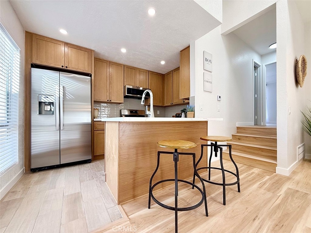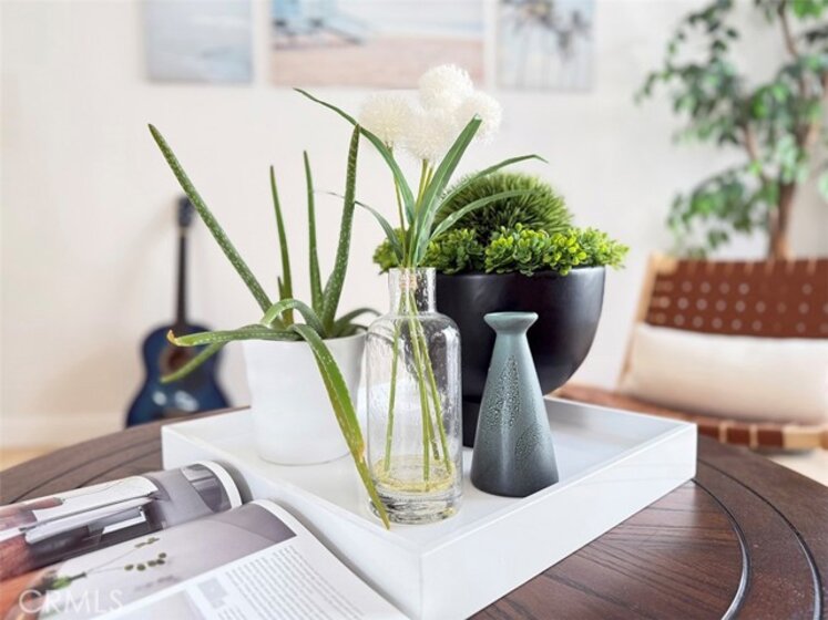 Welcome to this wonderful remodeled end unit townhome in South Coast Metro area. The gorgeous high beam ceiling and sky lights in the living room along with the open concept floor plan create a relaxing environment. The home showcases fully redesigned and remodeled kitchen with white oak cabinets, breakfast bar, and new stainless steel appliances. All new paint and wood plank luxury vinyl flooring throughout the house and tile in kitchen and bathrooms. The dining area is enhanced with new ceiling lighting, creating a bright and welcoming space for meals and entertaining. The primary suite is conveniently located on the first floor and includes an en-suite bathroom fully updated with designer tile, shower and modern cabinetry. The suite is very spacious has an impressive 10 feet high ceiling with beautiful installed slat panel wall, a walk-in closet and a private outdoor patio with a secured gate. Upstairs, the second and third bedrooms share a bathroom that has been completely remodeled with designer tile, new cabinetry and bathtub. Residents also enjoy lush green areas and access to a community pool and spa just a short walk away. Ideally located, this home is just minutes from restaurants and shops, South Coast Plaza, Segerstrom Center for the Arts, 405 and 55 fwys, UCI, John Wayne Airport, Newport and Huntington Beach. Welcome home!