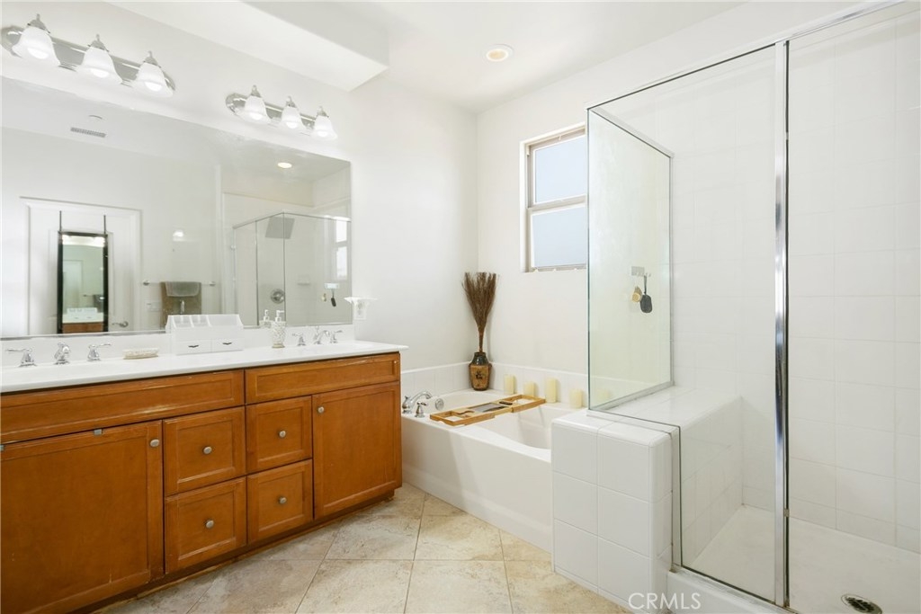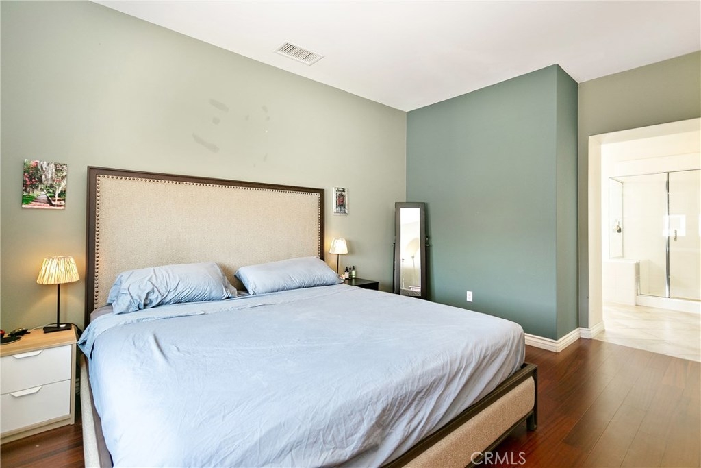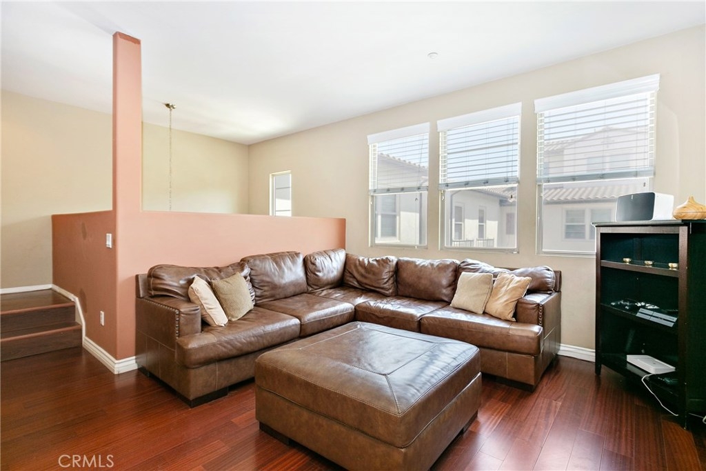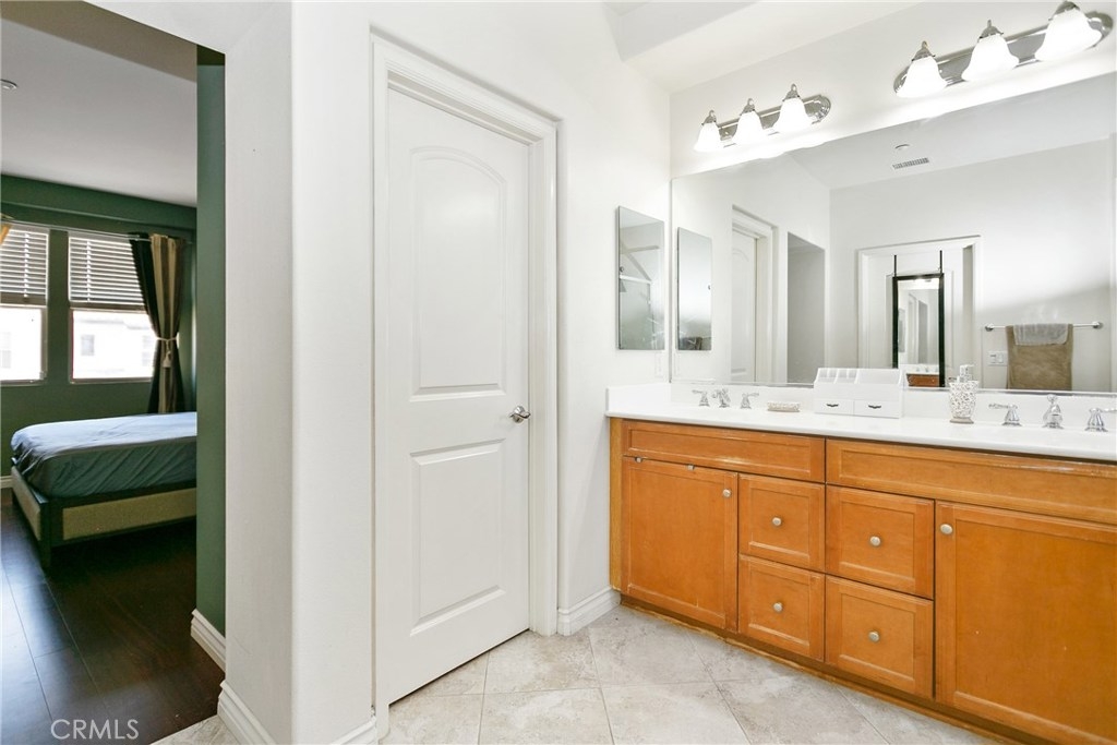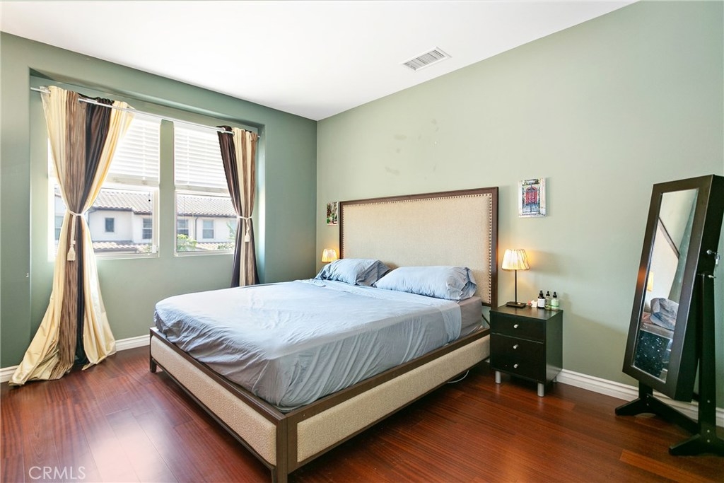 This roomy, versatile floor plan is well located in small, gated enclave known as Avenue E. This newer townhome features two separate masters, high, smooth ceilings, recessed lighting, raised panel doors, and dual paned windows. It's upgraded with wood floors throughout the living areas and in the master bedroom. On the entry level you'll find one bedroom with an ensuite full bath with a slider to the front patio plus access to the two car garage. Up the stairs on the main level are the "greatroom" plus two additonal secondary bedrooms, a full hall bath and full size laundry closet. The open living areas are wide open and flow seamlesslessly. The kitchen has corian counters and a generous amount of wood cabinetry. There's also a large island with bar seating. The living room is brightened with abundant windows that bring in natural light. Upstairs on the third level is the private master suite that overlooks the charming courtyard. Large enough for a kingsize bed it has high ceilings and wood floors. Th ensuite full bath has a large soaking tub and separate shower with a glass enclosure. There are his&hers sinks and a wood vanity with storage. It also has a huge walk in closet! There's a cobbled brick front patio that is accessible through a sliding door in the downstairs bedroom. Close to parks, South Coast Plaza shopping, restaurants and entertainment.