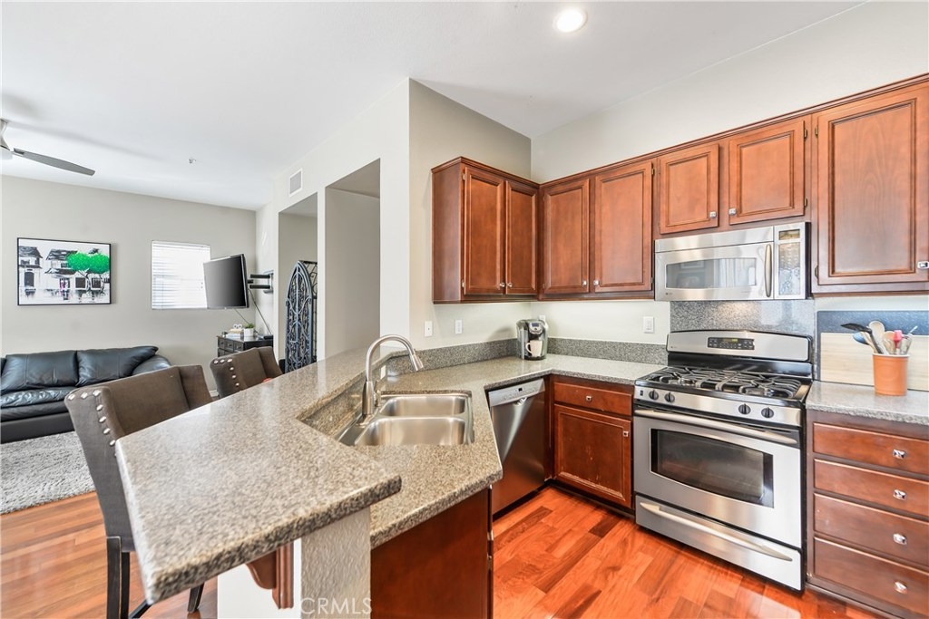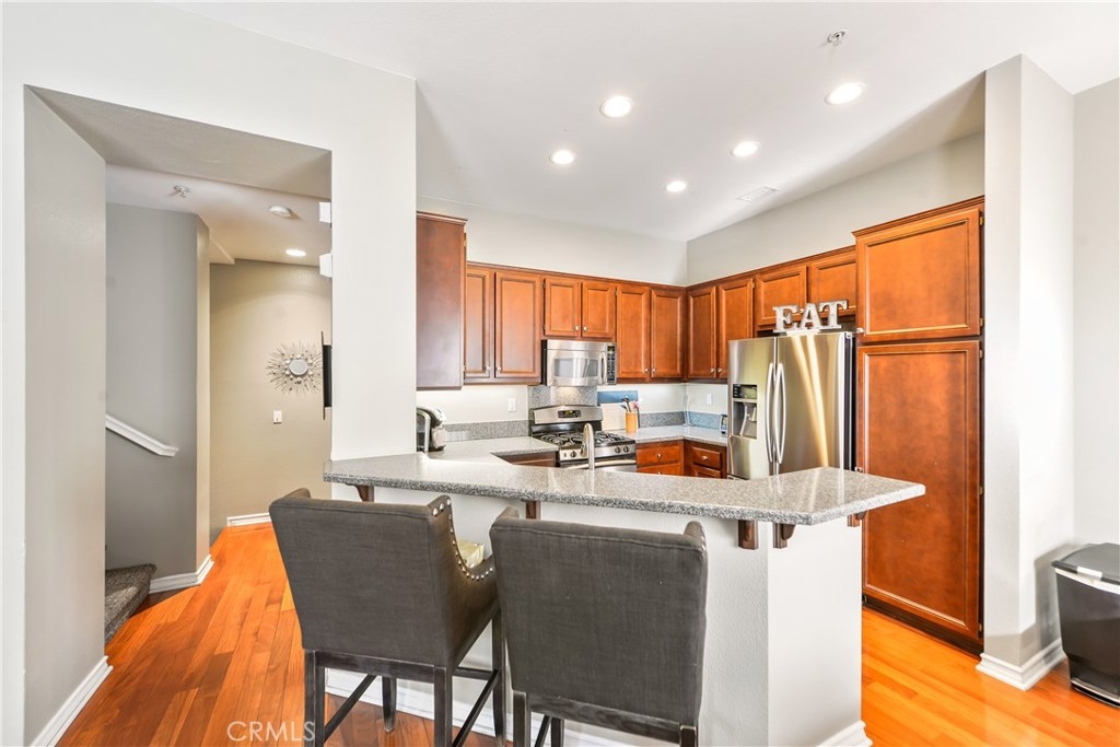 Beautiful end unit townhouse located in the Luxury Vantage gated community. Spacious open floor plan with hardwood floors , window blinds , storage and lots of natural light throughout the home. Large living room with fireplace and ceiling fan. Kitchen with stainless steel appliances, granite counters plenty of cabinets and a breakfast bar. dining area with balcony. Powder room also located on this level. Both bedrooms are located upstairs, Master bedroom with a ceiling fan, walk in closet, large tub , separate shower, and double sinks. Large second bedroom with ceiling fan and a full bath in the hall. This unit has a large attached 2 car garage with laundry hook ups. Beautiful community with a resort style pool area with sparkling pool, cabanas, bbq areas, spa, showers, bathrooms. Grassy areas and beautiful landscaping throughout the complex. Exterior of building has been recently painted. Plenty of guest parking, and carports for residents on a first come first serve basis. Close to Shopping, airport, South Coast Plaza, beaches, and very convenient to freeways.