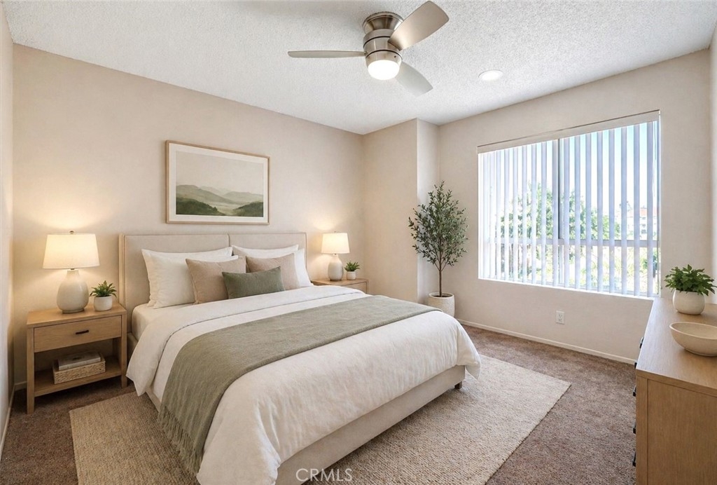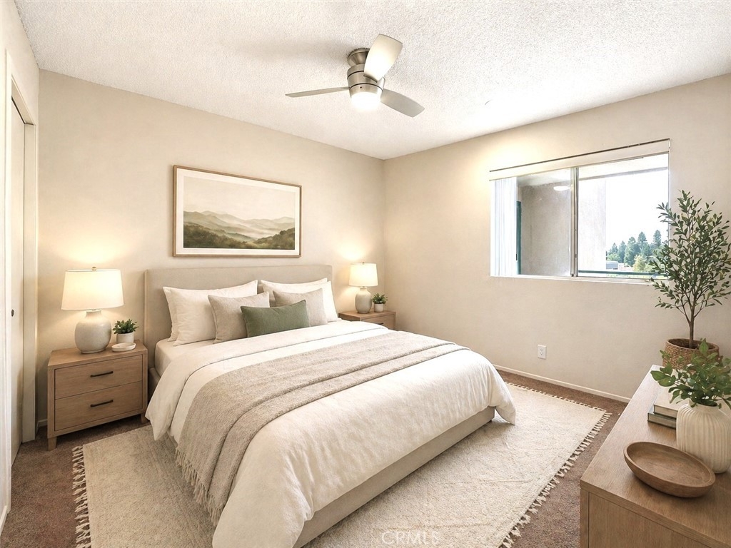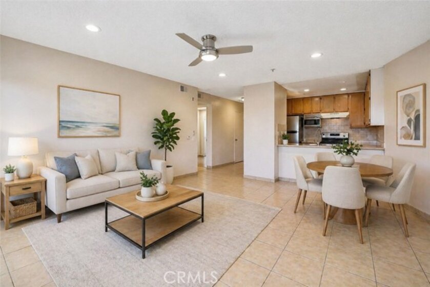 Welcome to this bright and inviting upper-level condo in a desirable Santa Ana location! This well-maintained home features a spacious open layout where the living room, dining area, and kitchen flow seamlessly together—perfect for everyday living and entertaining. The living room offers a cozy fireplace and sliding glass doors that open to a private balcony, providing natural light and refreshing airflow. The kitchen has been tastefully updated with stainless steel appliances, ample cabinetry, and a functional layout that connects effortlessly to the main living space. Recessed lighting throughout enhances the light and airy feel, while ceiling fans in the living room and both bedrooms help maintain comfort year-round. Both bathrooms have been remodeled, featuring updated finishes and new bathtubs. The bedrooms are generously sized, offering comfortable retreats with plenty of natural light. Enjoy pleasant city light views and a comfortable indoor-outdoor feel, along with the added benefit of a screen door for fresh air circulation. Additional highlights include two assigned covered parking spaces and HOA amenities such as a sparkling pool, clubhouse, playground, water, and trash—helping simplify monthly expenses. Located in a vibrant area near dining, shopping, entertainment, and major freeways, this home offers both convenience and lifestyle. Great opportunity for homeowners or investors—don’t miss it!