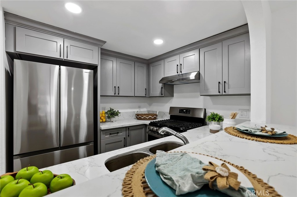 Fully Remodeled 1 Bedroom 1 Bathroom Open Concept condo located in the Heart of Downtown Santa Ana. Unit is located on the 2nd floor. Stunning Light Oak Vinyl Flooring runs throughout the entire unit. The Newly Renovated Gourmet Kitchen features Beautiful New Cabinetry, On Trend Black Hardware, New Stainless Steel Appliances and Gorgeous Quartz Counters. Enjoy a Spacious Living Room and the perfect Dining Area. The Newly Renovated Bathroom offers a Spacious Walk In Shower and Relaxing Bathtub for convenience, Dual Sink Vanity, and Designer Light Fixture. The Light and Bright Bedroom is Spacious, Freshly Renovated with Vinyl Flooring, Ceiling Fan, and Recessed Lights. Enjoy the views of Lush Trees on your Spacious Balcony perfect for that morning cup of coffee! This Home Is Move In Ready! Convenient Location within Walking Distance of the Santa Ana Civic Center, Schools, Variety of Trendy Restaurants and Shopping. HOA offers a Gated Community, with Underground Parking, and Laundry Room.